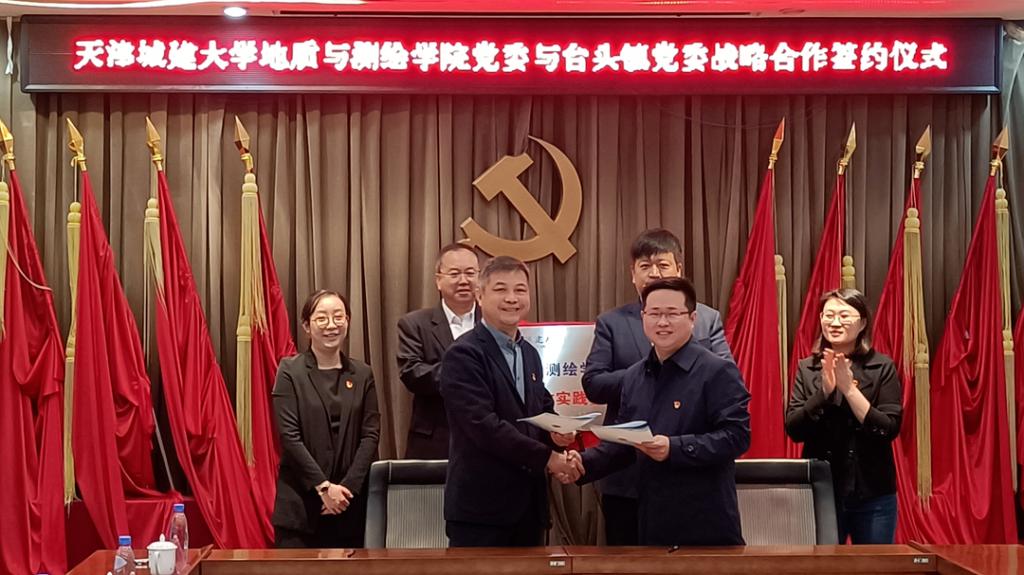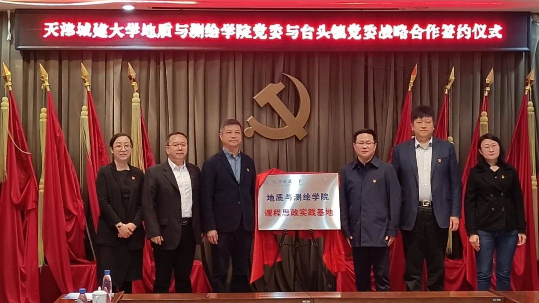 4月27日,地质与测绘学院党委与天津市静海区台头镇党委战略合作协议签署仪式暨课程思政实践基地揭牌仪式在台头镇政府举行,台头镇党委书记蒋峣,党委副书记、镇长岳友岭,党委副书记辛长艳和beat365vip官网登录入口地质与测绘学院党委书记尚军,院长汪东川,党委副书记白静及有关同志出席签约仪式。