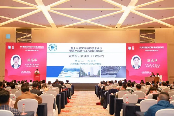 会上,陈志华以《索结构研究进展及工程实践》为题作特邀报告,梳理了建筑索结构的发展历史,讲解了近年来预应力拉索构件、节点以及预应力建筑索结构的力学性能研究成果,并生动展示了一系列索结构研究成果在天津博物馆、天津保税区国际商务交流中心、山东茌平体育馆等实际工程中的具体应用。