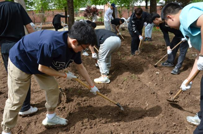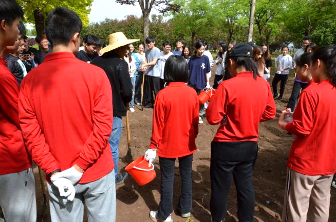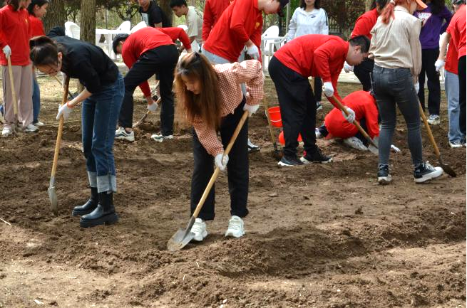 随后,大家划分为10个小组,分工协作,挥楸铲土,翻耕土壤,将土块捣碎,整理出一块一块的菜畦,各个环节衔接有序。