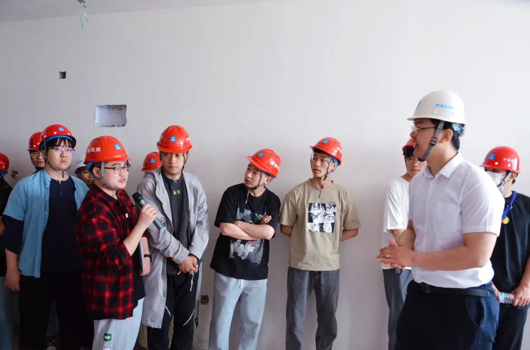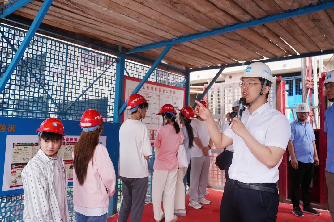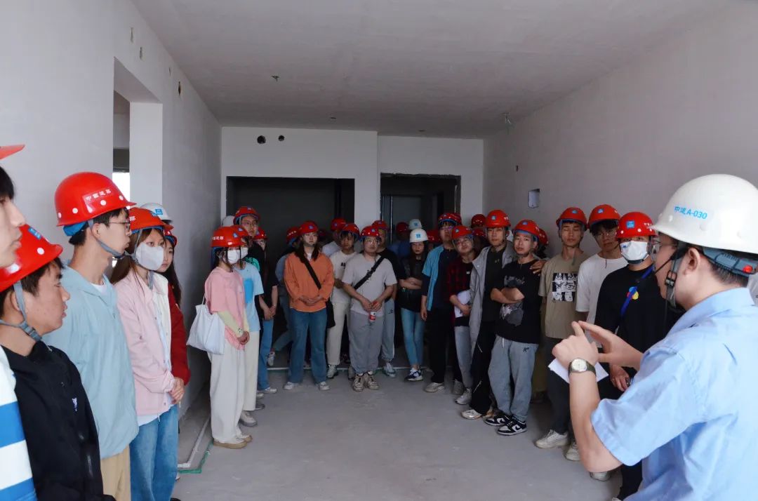 随后,大家乘坐直梯进入项目内部,深入工地现场,技术部经理李海龙对本项目进行现场技术分析,为同学们讲解了当前所在工程的地质结构特点、房屋建造过程、施工质量控制以及专业知识如何在建设项目中发挥作用等。在场的同学们就项目建设、知识实践运用等方面积极提问,李龙和项目部副书记宋博进行了耐心解答,与同学们交流互动,使大家对理论知识与工程实践的结合有了新思考、新认识。