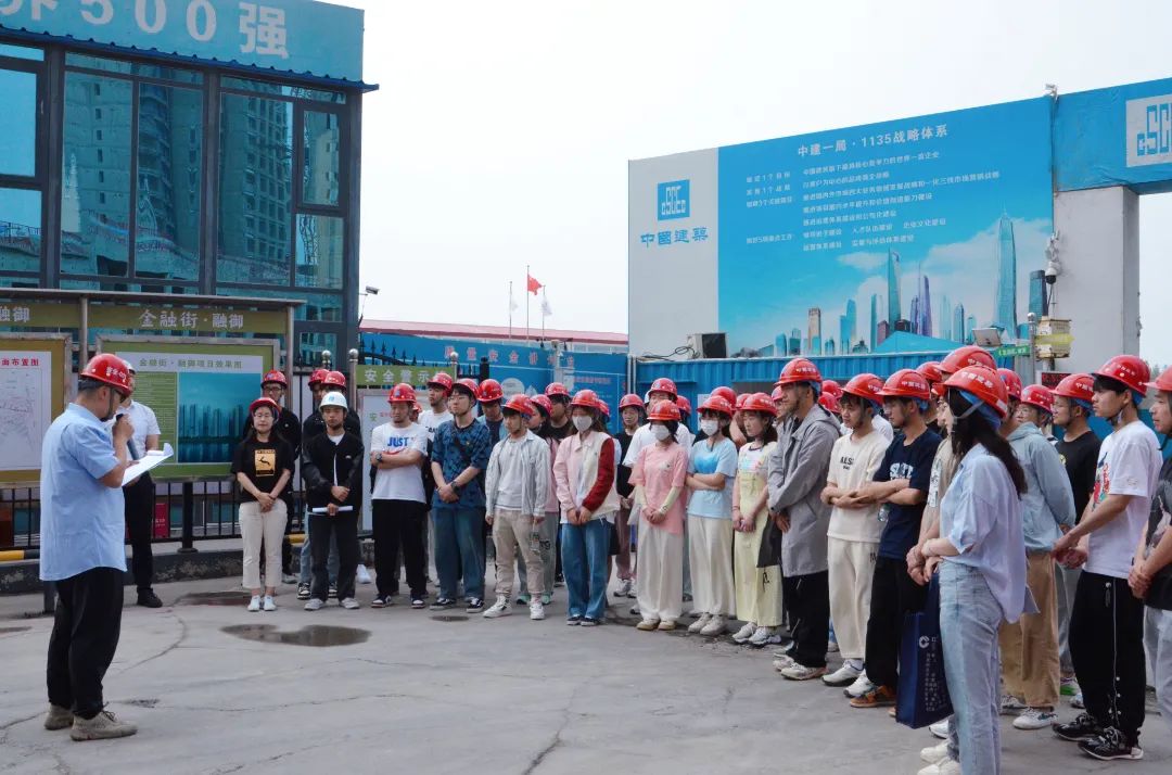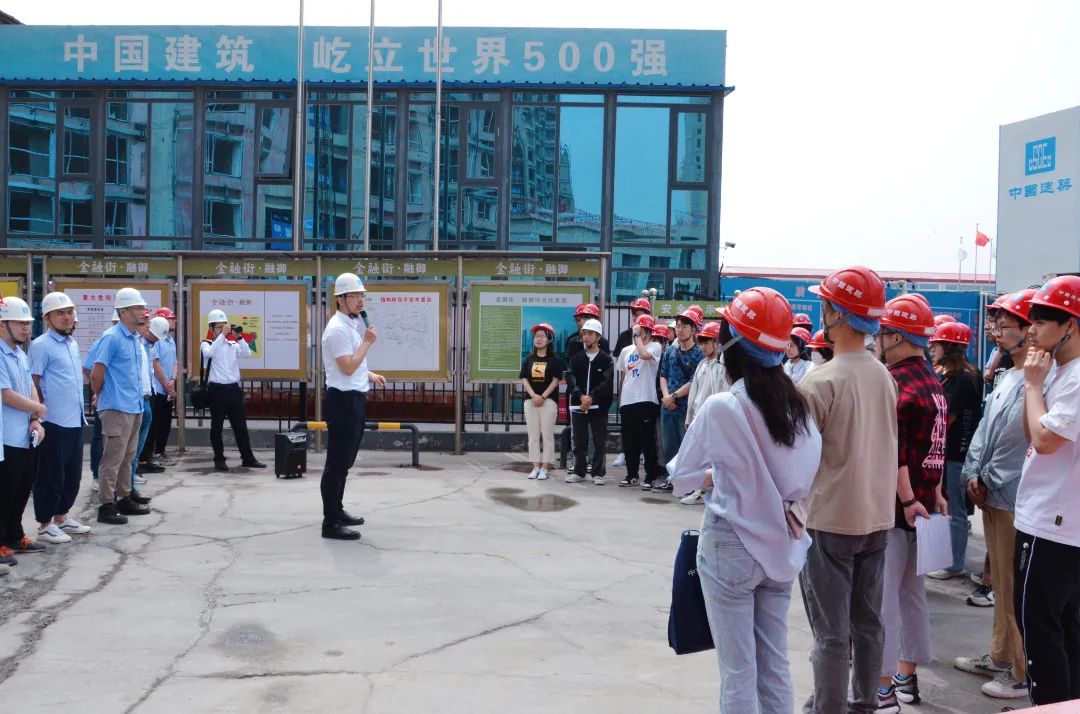 中建一局建设发展公司华北分公司综合管理部经理李龙对beat365vip官网登录入口师生的到来表示欢迎,介绍了中建一局成立70周年来,公司始终秉承以高质量党建引领保障高质量发展,希望同学们积极向党组织靠拢,牢记初心使命,深耕专业技能,勇担时代责任。中建一局建设发展公司天津“金融街滨海融御”项目工程部经理牛洋、安全部经理张刚为在场师生详细介绍了该项目的整体概况、设计理念、结构特征以及工程安全注意事项等情况,并带领大家参观了项目的施工现场。