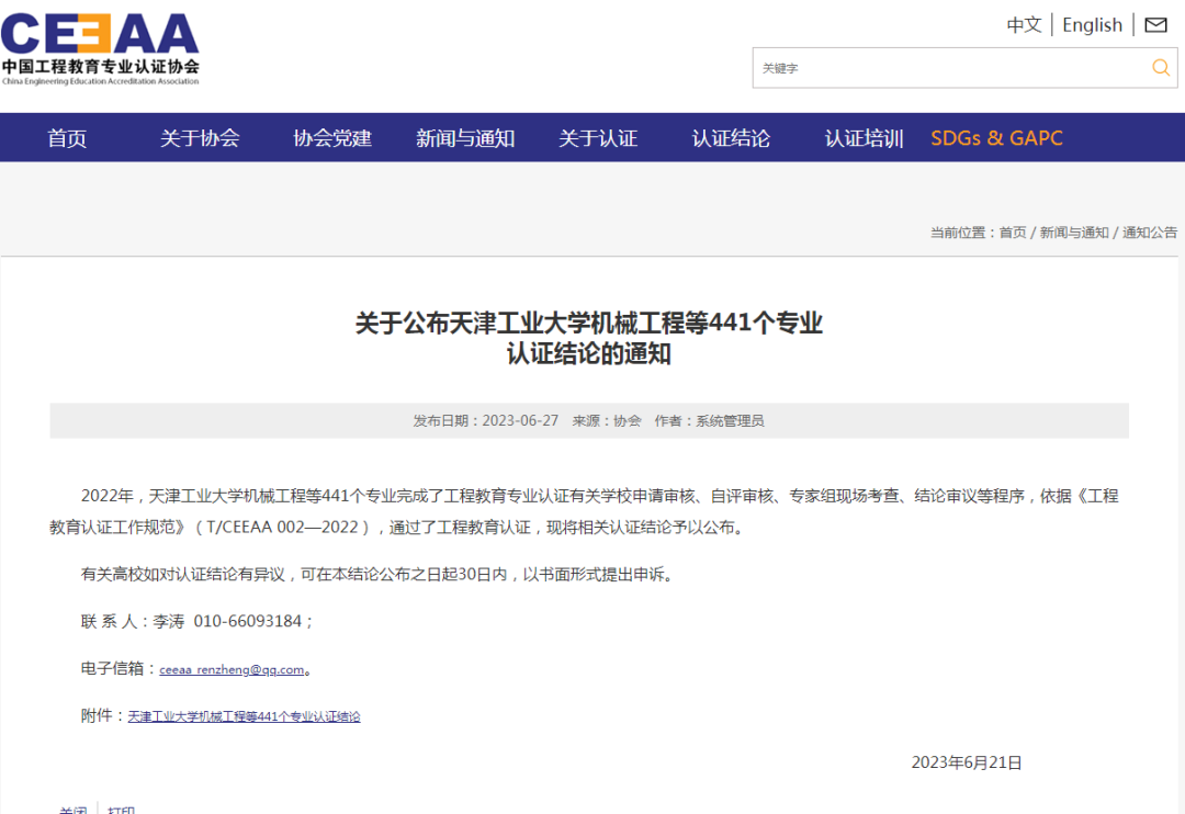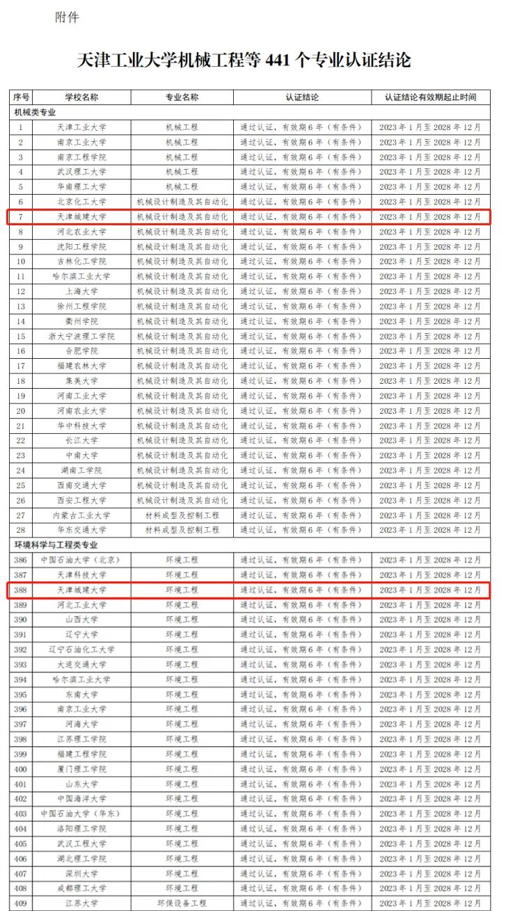 日前,中国工程教育专业认证协会官网发布《关于公布天津工业大学机械工程等441个专业认证结论的通知》,beat365机械设计制造及其自动化专业、环境工程专业通过了工程教育认证,有效期为六年(有条件),认证结论有效期起止时间为2023年1月至2028年12月。