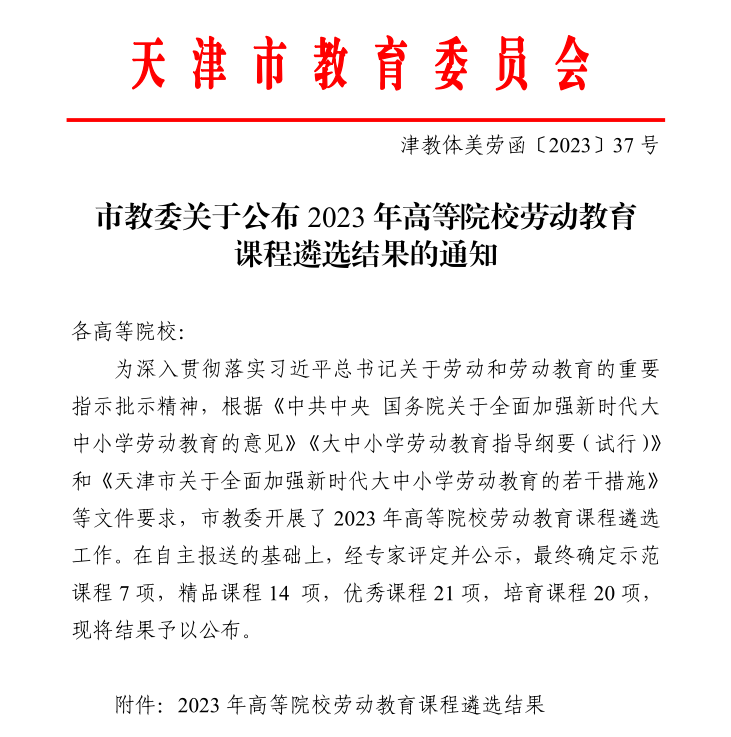 近日,市教委公布2023年高等院校劳动教育课程遴选结果,beat365推荐的《建筑测绘》《城乡社会综合调研》两门课程分别获评天津市劳动教育优秀课程与培育课程。自2022年市教委启动高等院校劳动教育课程遴选工作以来,beat365已有四门课程入选。