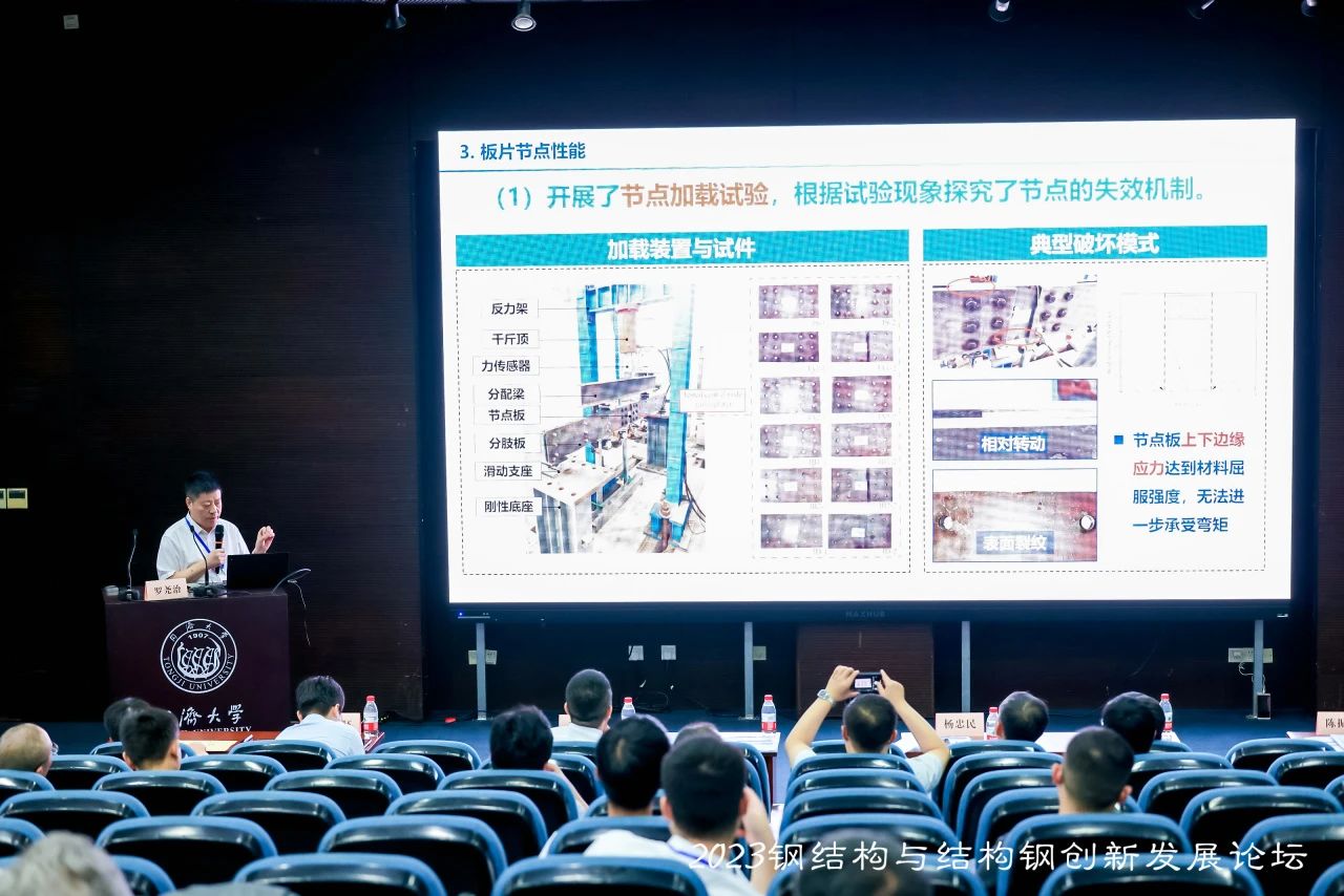 ●专题4:特种结构钢及其结构应用专题论坛,由同济大学罗永峰教授与南京钢铁股份有限公司新材料研究院联席院长陈林恒高工共同主持。首钢技术研究院杨永达高工、同济大学土木工程学院副院长吴昊教授、南京钢铁股份有限公司板材事业部能源用钢研发室主任潘中德高工、河海大学力学与材料学院副院长周一一教授、南阳汉冶特钢有限公司钢铁研究院李忠波院长、华南理工大学土木工程系副主任康澜副教授、同济大学土木工程学院院长助理贾良玖研究员分别作了《首钢特色功能化结构钢的研发及应用》、《装甲钢动态力学性能与抗弹体高速冲击研究》、《南钢能源用钢的开发与应用》、《周期性负泊松比蜂窝钢结构研究》、《1000MPa级高强度水电钢组织与性能研究》、《激光熔覆修复局部损伤圆钢管的轴压力学性能》、《负泊松比钢多尺度原位试验研究》的报告。