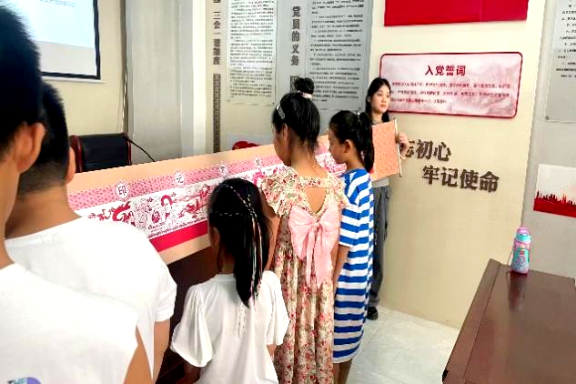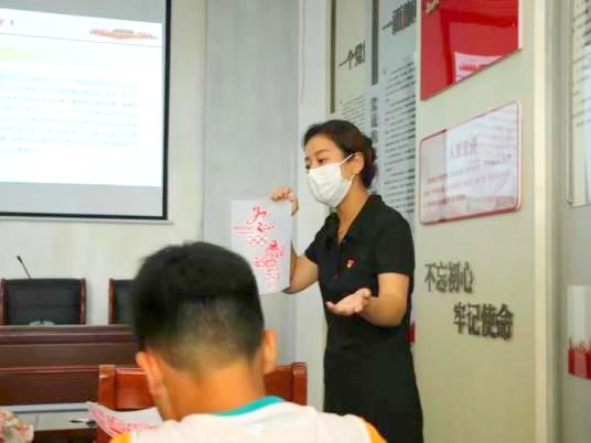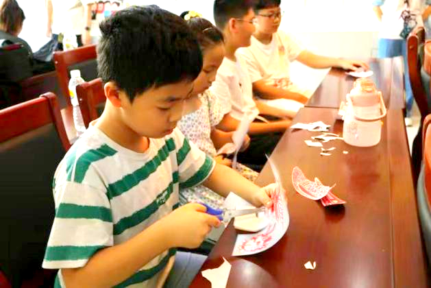 实践团成员带领社区中小学生近距离欣赏绘制的非凡十年历史长卷,并讲解长卷中发生的历史事件、对应时间节点以及代表性建筑。宣讲结束后,实践团带领孩子们进行红色剪纸活动,共同寻找所剪图形在长卷中对应的位置。剪纸活动不仅提高了孩子们的动手能力,而且激发了他们的爱国主义情怀。