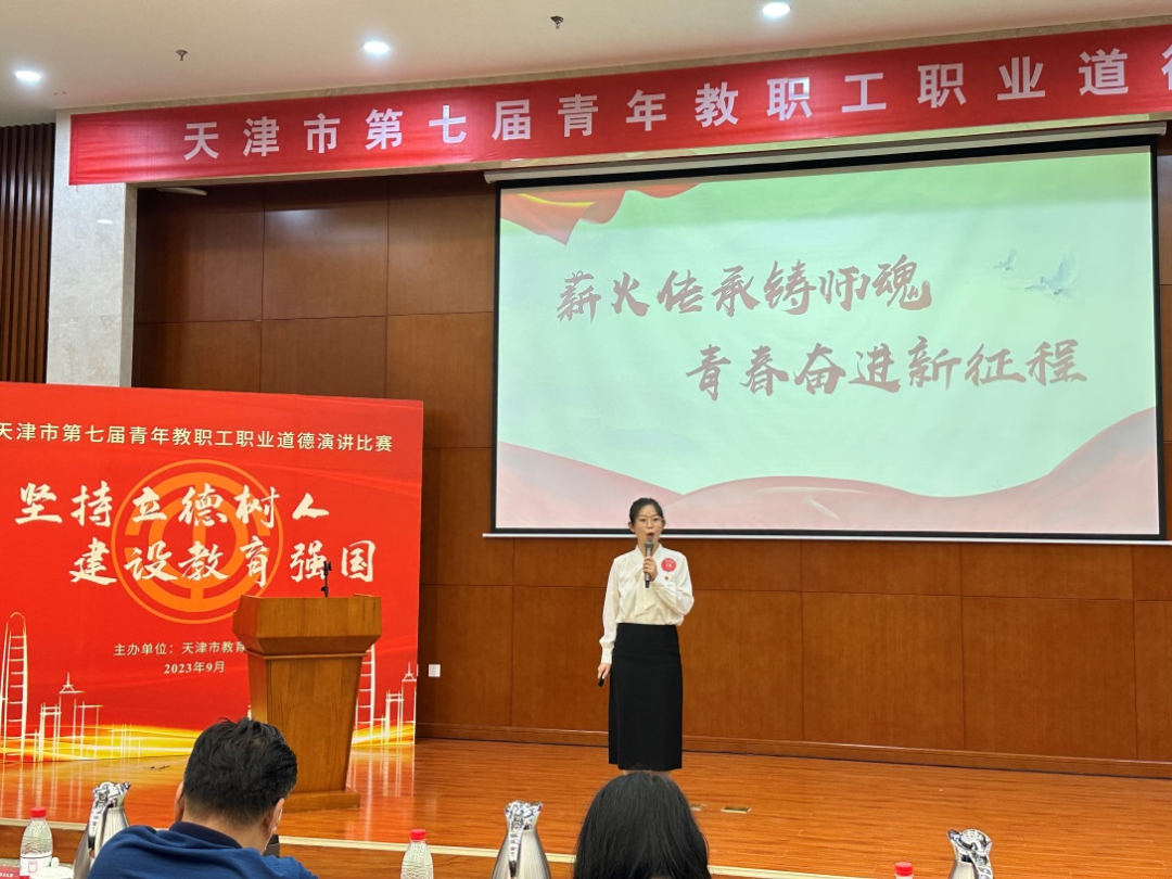 9月26日,由市教育工会主办的天津市第七届青年教职工职业道德演讲比赛在市总工会举行。beat365马克思主义学院教师荣文秀以“薪火传承铸师魂 青春奋进新征程”为题参赛,荣获比赛二等奖。