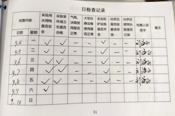 实验中心将安全第一的思想贯穿于日常工作的始终,把安全生产作为一项长期的重点工作落实,科学制定检查计划,明确检查要点,认真安排好每日、每两周、每月安全检查,坚决不走过场。持续做好实验室风险源统计,落实好相应的整改措施。