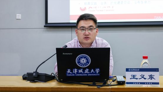 天津师范大学天津市水资源与水环境重点实验室教工党支部书记王义东老师,围绕“党建+业务”互融互促、引领事业高质量发展,从对“双带头人”工作室的理解、支部党建特色经验及成效等方面作交流发言。