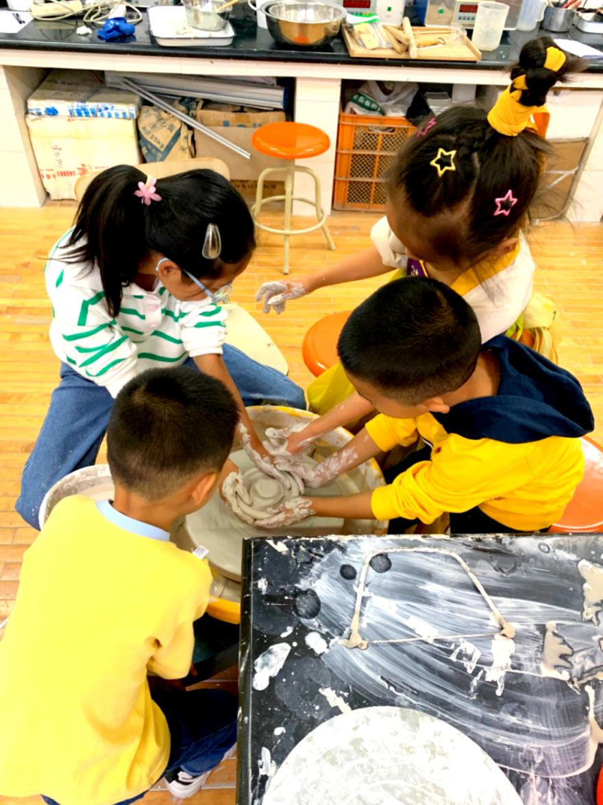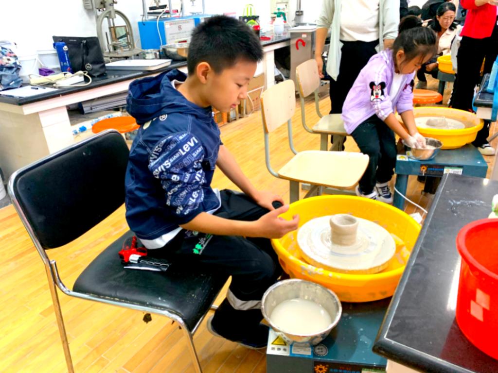 一走进陶瓷文化传承与制作科普基地,孩子们就被美轮美奂的陶瓷作品深深的吸引住了,指着展示柜中的陶瓷作品问东问西,了解了很多关于陶瓷方面的知识,尤其是对如何制作陶瓷充满了好奇心。当指导老师刚把拉坯泥料摆出来的时,孩子们都已经撸胳膊挽好袖子跃跃欲试。