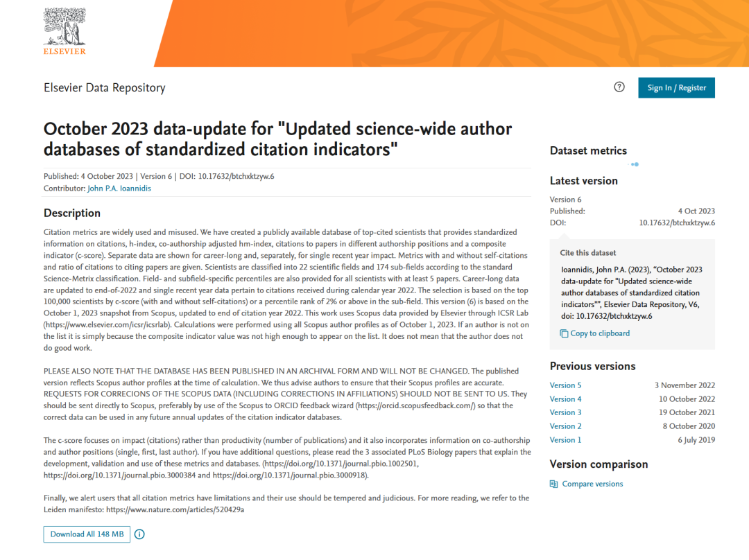 据悉,全球所有学科前2%顶尖科学家榜单是斯坦福大学John P. A. Ioannidis教授团队与Elsevier合作的项目成果,该榜单分为“学术生涯科学影响力排行榜”和“年度科学影响力排行榜”,是从近700万名科学家中遴选出世界排名前2%的科学家。该榜单于2019年7月首次发布,榜单基于Scopus数据库的引用数据系统分析,以被引数(区分自引和他引)、H指数、HM因子等综合指标(composite score,C-score)进行遴选,分为22个领域和174个细分子领域。为科学家科研表现提供了一个衡量指标,能够更客观、更真实地反映科学家的学术生涯期间的综合影响力与上一年的学术影响力。