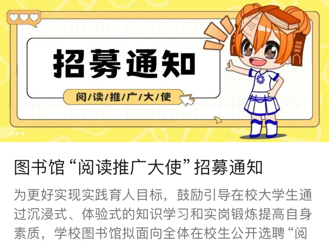 紧紧围绕今年信息服务月活动主题,注重与读者互动和读者体验,开展“简历工坊”指导培训,组织大三、大四学生与字节跳动员工通过网络一对一交流对未来工作的期待与困惑,指导学生求职者制作简历、模拟面试环节、进行职业规划,帮助学生们理清思路,找到下一步行动的方向,学生们纷纷表示在此活动中开拓了视野、打开了思路,从中受益匪浅。招募组建学生阅读推广大使团队,让学生深度参与图书馆发展建设。为全校考研学生制作了专题祝福推送,营造奋发努力的学习氛围。