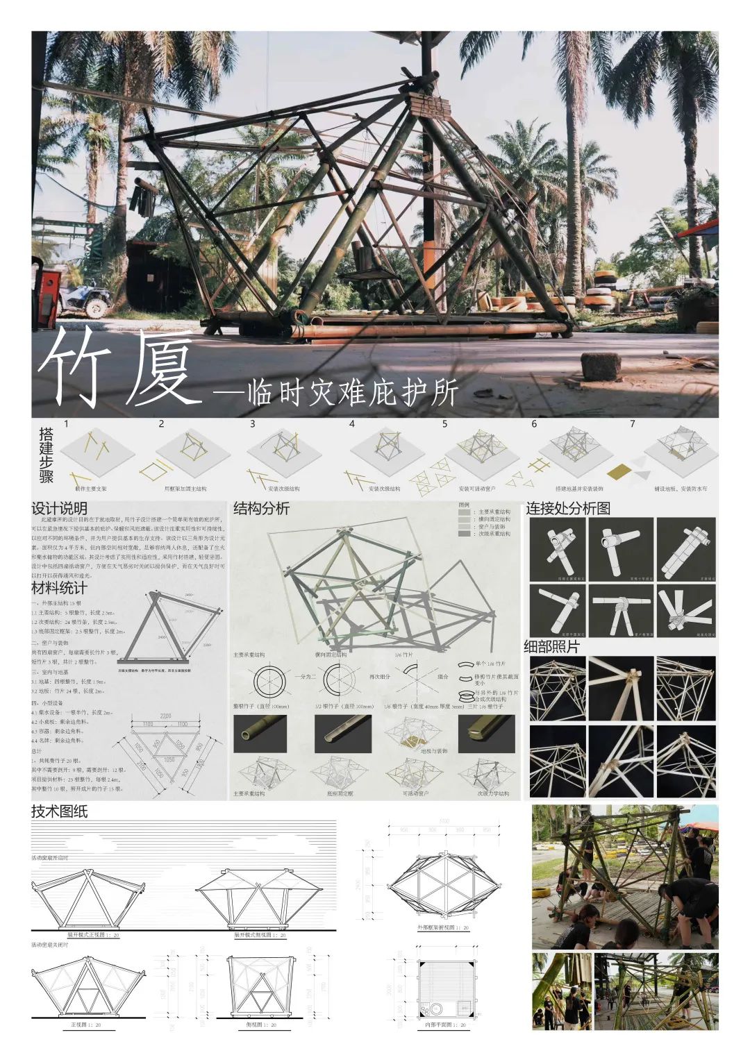 此届论坛由马来西亚拉曼大学主办,来自马来西亚、印度尼西亚、中国的7所高校共同参与。工作营主题为竹材的可持续性设计,旨在利用竹子为建材,打造出兼具实用性和美观性的建构作品,为当地偏远地区灾民设计搭建临时应急避难所。