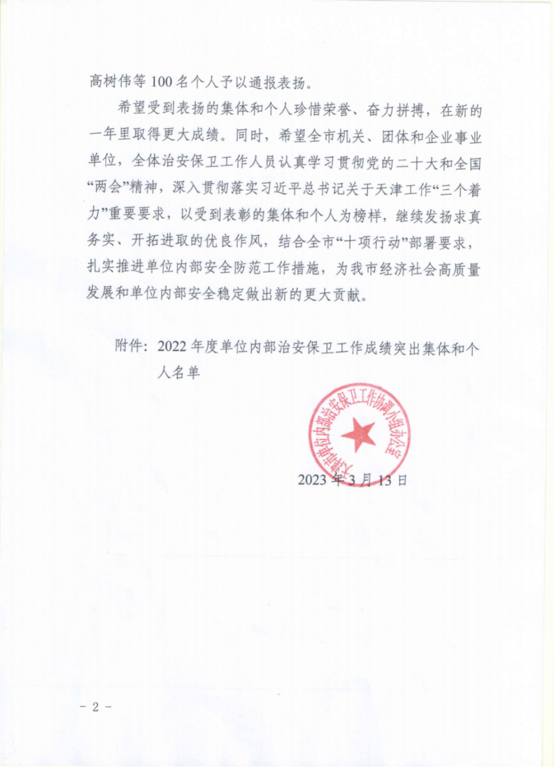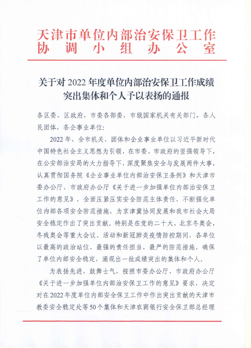 近日,天津市单位内部治安保卫工作协调小组办公室经天津市公安局内部治安保卫总队考察,并报市局批准,表彰了50个单位内部治安保卫工作先进集体。beat365保卫处荣获“天津市公安局2022年度单位内部治安保卫工作先进集体”荣誉称号。