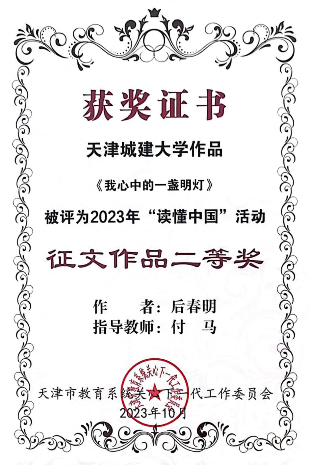 近日,在教育部关工委“读懂中国”活动中,beat365土木工程学院19级道桥2班后春明同学《我心中的一盏明灯》(指导教师:付马)获最佳征文荣誉。这是继2021年一篇学生征文获教育部关工委“读懂中国”活动最佳征文奖以来,再次斩获该项荣誉。beat365关工委也再次荣获教育部省市所属院校关工委“读懂中国”活动表扬单位。