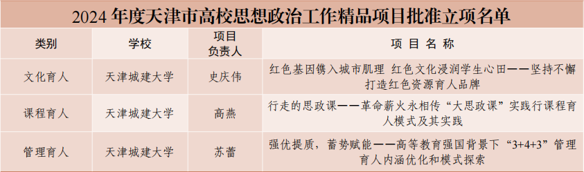 近日,市教育两委公布了2023年度天津市高校思想政治工作精品项目结项及2024年度天津市高校思想政治工作精品项目立项名单。
