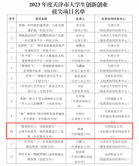 据悉,天津市大学生创新创业拔尖项目由市委教育工委、市教委设立,旨在培养和提高大学生创新、创意、创造、创业的意识和能力,助力各高校涌现出更多优秀的大学生创新创业项目,培育具有天津特色的高质量创新创业成果。