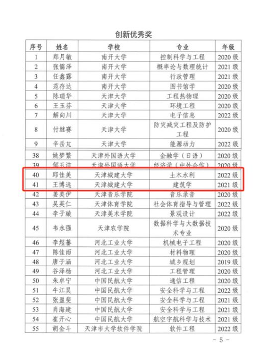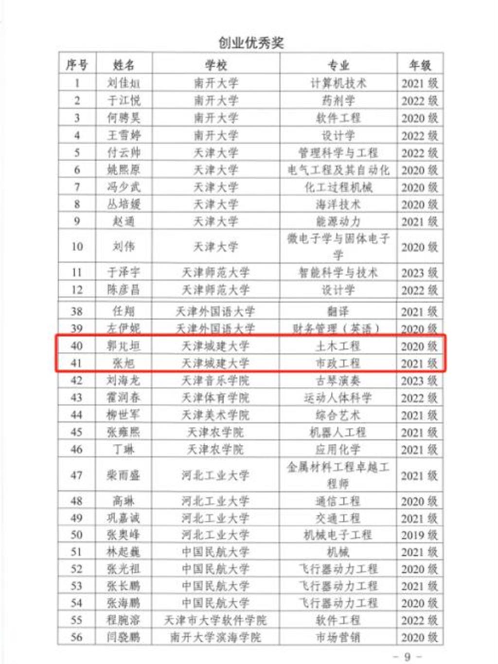 材料科学与工程学院2021级硕士研究生聂伟星被授予天津市大学生创新特等奖学金(天津市仅10名);计算机与信息工程学院2016级本科生史堰南被授予天津市大学生创业特等奖学金(天津市仅10名)。经济与管理学院2022级硕士研究生邱佳美,国际工程学院2021级本科生王博远荣获“创新优秀奖”。土木工程学院2020级本科生郭芃垣,环境与市政工程学院2021级硕士研究生张旭荣获“创业优秀奖”。