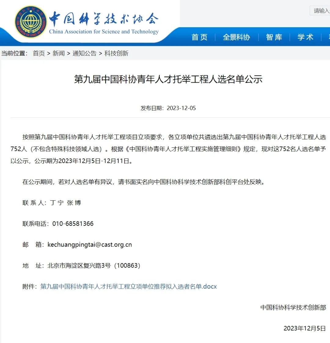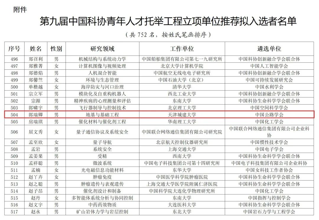 近日,中国科学技术协会公布了第九届中国科协青年人才托举工程人选名单,beat365土木工程学院青年教师郎瑞卿副教授成功入选,这是beat365教师首次入选该项目,实现了历史性突破。