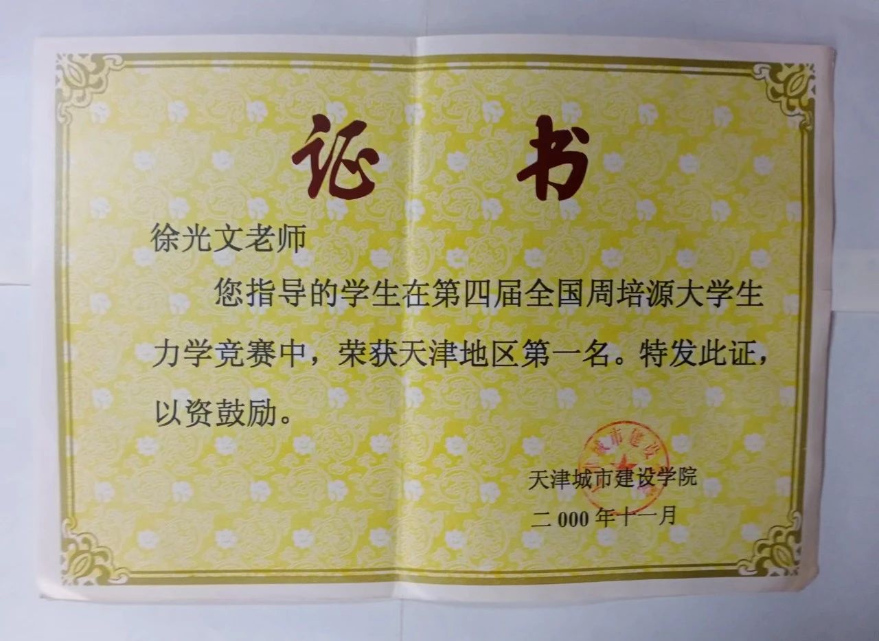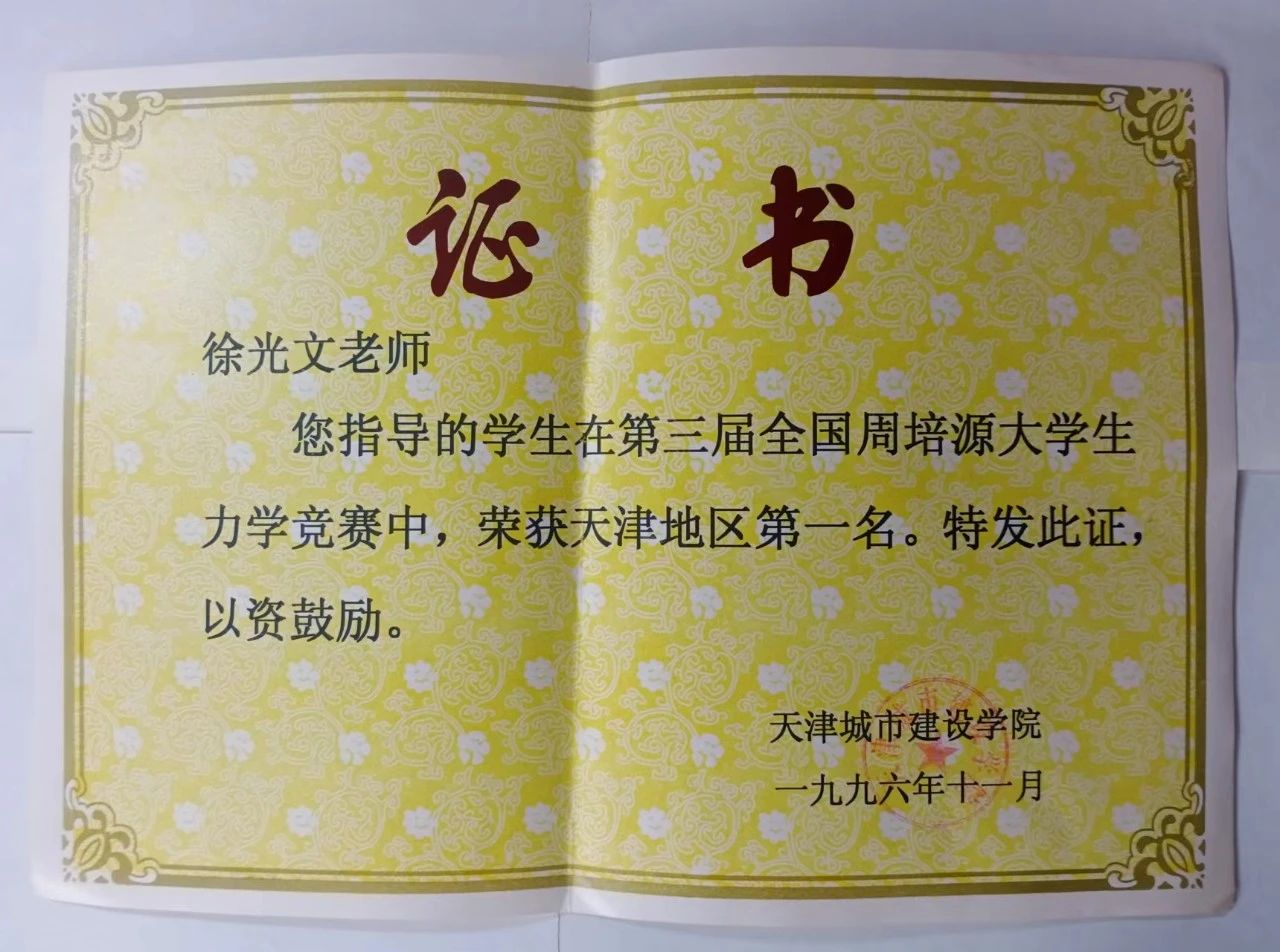 1996年,咱们学校首次参加中国力学会主办的全国周培源大学生力学竞赛(第三届)。此项竞赛是我国最具含金量与影响力的力学类赛事,是经教育部高教司批准的大学生科技竞赛项目。客观来讲,各参赛高校要论校史、论实力、论规模可能都比咱们要大和强,所以我们抱着重在参与并向兄弟院校学习的心态参赛。但是参赛结果十分振奋人心,学校力学竞赛代表队在全国高等院校“周培源”力学竞赛中荣获天津赛区团体第二名,土木工程系1993级工民建专业沈宏武同学的个人名次雄居天津赛区榜首,而且是领先第二名20多分,具有很大的领先的优势。这样的结果令其他参赛高校有点惊讶,甚至有人将此次获奖归结于偶然因素。
