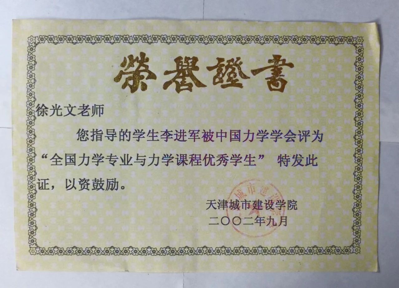 在学校的精心培养下,2002年,我指导的学生李进军被评为“全国力学专业和力学课程优秀学生”。