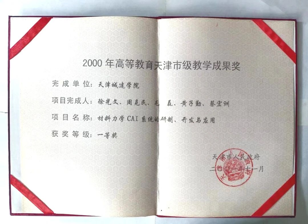 “材料力学CAI系统的研制、开发与应用”获天津市人民政府授予的2000年高等教育天津市级教学成果一等奖
