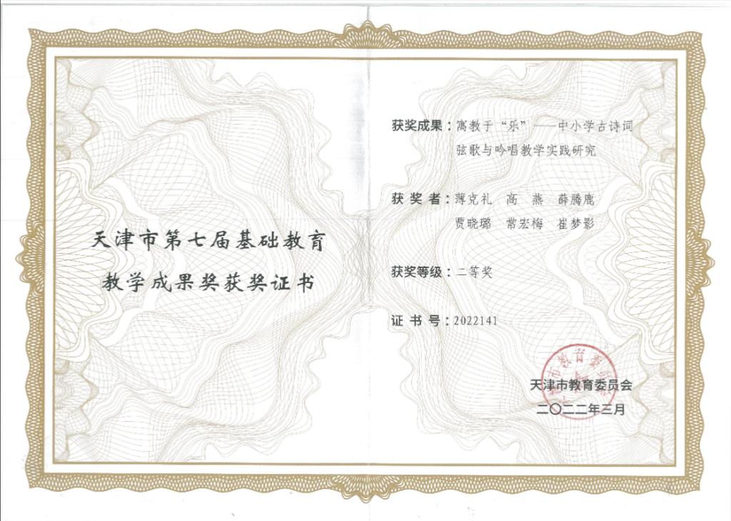 2022年荣获天津市第七届基础教育教学成果奖二等奖