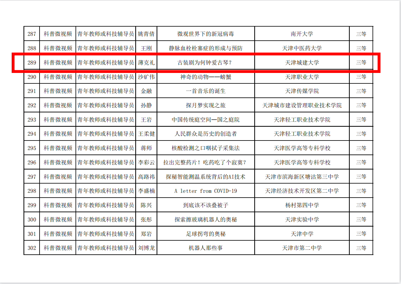首届天津市“大学—中学”科普创新大赛三等奖