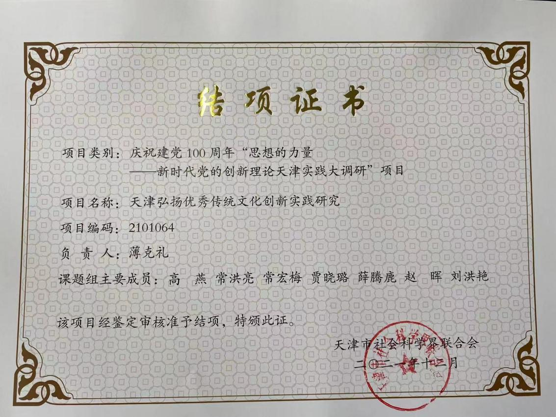 2021年顺利完成天津市百年百题大调研课题一项《天津弘扬优秀传统文化创新实践研究》