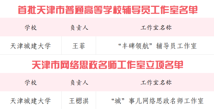 积极培育示范平台,以天津市首批辅导员工作室—“丰碑领航”辅导员工作室和天津市首批网络思政名师工作室—“‘城’事儿”网络思政名师工作室为载体,着力打造辅导员工作示范区和“样板间”。坚持以评促建,定期评选校“十佳辅导员”、举办辅导员素质能力大赛等,激发队伍内生动力,提高辅导员思想引领、心理咨询、学习指导、危机应对等方面能力,服务学生全面成长成才。近年来,3名辅导员先后获评天津市十佳辅导员,9名辅导员获评天津市优秀辅导员,4名辅导员获评天津市优秀共青团干部,1名辅导员获评“天津向上向善好青年”。