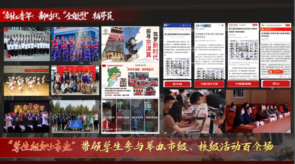 作为学生会、繁星学社的大家长,创建“社团+专业”模式,与专业教师深度合作,范佳悦带领学生参与亚洲建筑论坛等活动百余场,与天大、天津博物馆、少年宫等地共建,走遍26个乡村、学校、菜市场,受到天津日报、北方网等多家媒体报道。作为发声者,她曾在丰碑展开幕式、开学典礼、建筑文化节上用朗诵热情讴歌天津这片红色热土,创建“薪火·丰碑”讲解团,带领学生累计讲解百余场。作为新媒体人;建筑学院官微关注量达6586人,单篇阅读量超2500,荣获天津市大学生新媒体大赛一等奖。在新时代“全能型”辅导员这条路上她走的很辛苦,但却无比坚定。