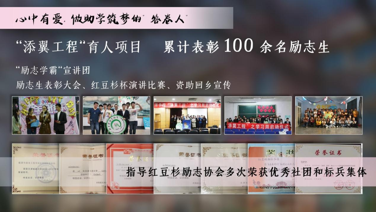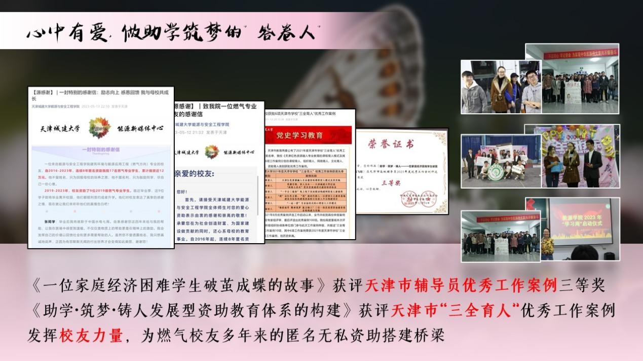 开展“励志学霸”宣讲团,打造励志生表彰大会、“红豆杉杯”演讲比赛、回乡资助宣传等“添翼工程”育人项目,累计表彰100余名品学兼优的励志生,为困难生搭建互帮互助、能力提升平台。指导红豆杉励志协会多次荣获优秀社团和标兵集体。《一位家庭经济困难学生破茧成蝶的故事》获评天津市辅导员优秀工作案例三等奖,《助学·筑梦·铸人发展型资助教育体系的构建》获评天津市“三全育人”优秀工作案例。发挥校友力量,为燃气校友多年来的匿名无私资助搭建桥梁,用爱的力量引导受助学生感恩回馈。