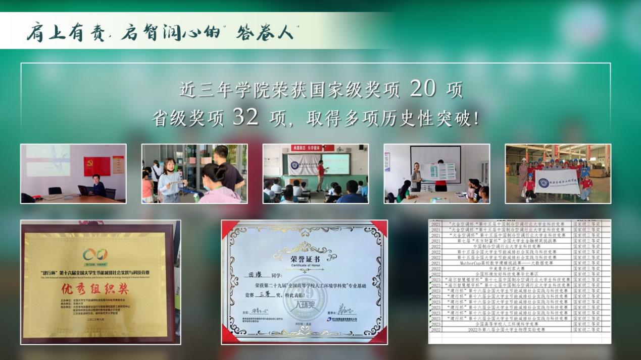 搭建双创平台,开创了学校节能减排大赛、传承学院暖通空调制冷大赛,做细“人环奖”专业学科知识竞赛,打造了50期学风学术论坛。近三年学院荣获国家级奖项20项,省部级奖项32项,多项取得历史性突破,让科技力量融入学生实践。