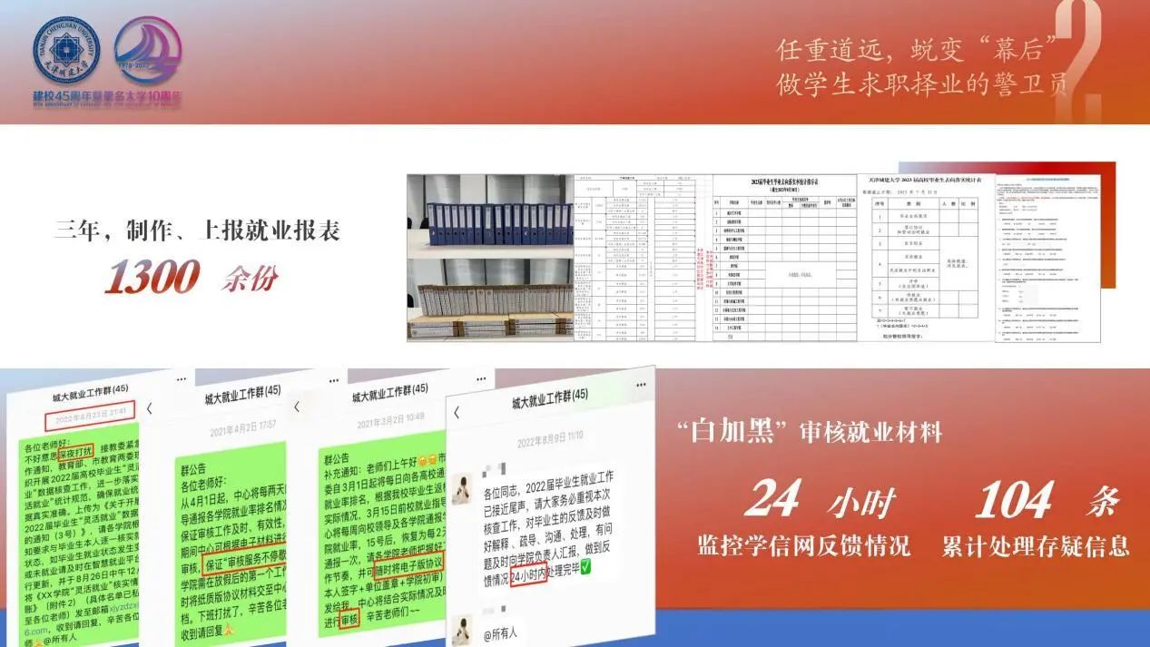 2020年10月,她转岗至就业指导中心,迎来青春长征的转折点。走好责任之路,她以“高站位、精标准、强措施”的工作态度,做学生求职择业的警卫员。“挂图作战”倒排工期,每天“一张表”,实时跟踪毕业生网签情况、求职进度;每周“一张图”,精细化对比同期就业数据,加强就业状况分析研判;每月“一目标”,对标院级目标确保责任落实。三年来,制作、上报各类就业报表1300余份,完成1.2万余名毕业生就业手续办理。每个就业关键期,“白加黑”审核就业材料,24小时监控学信网反馈情况,组织校级就业核查20轮,配合完成市级核查8轮,每年逐一审核全部毕业生就业材料2轮,确保各项数据准确无误。学校连续三年初次毕业去向落实率在天津市普通本科院校中位列前四,在2023年就业质量考核评价中评为“优秀”。