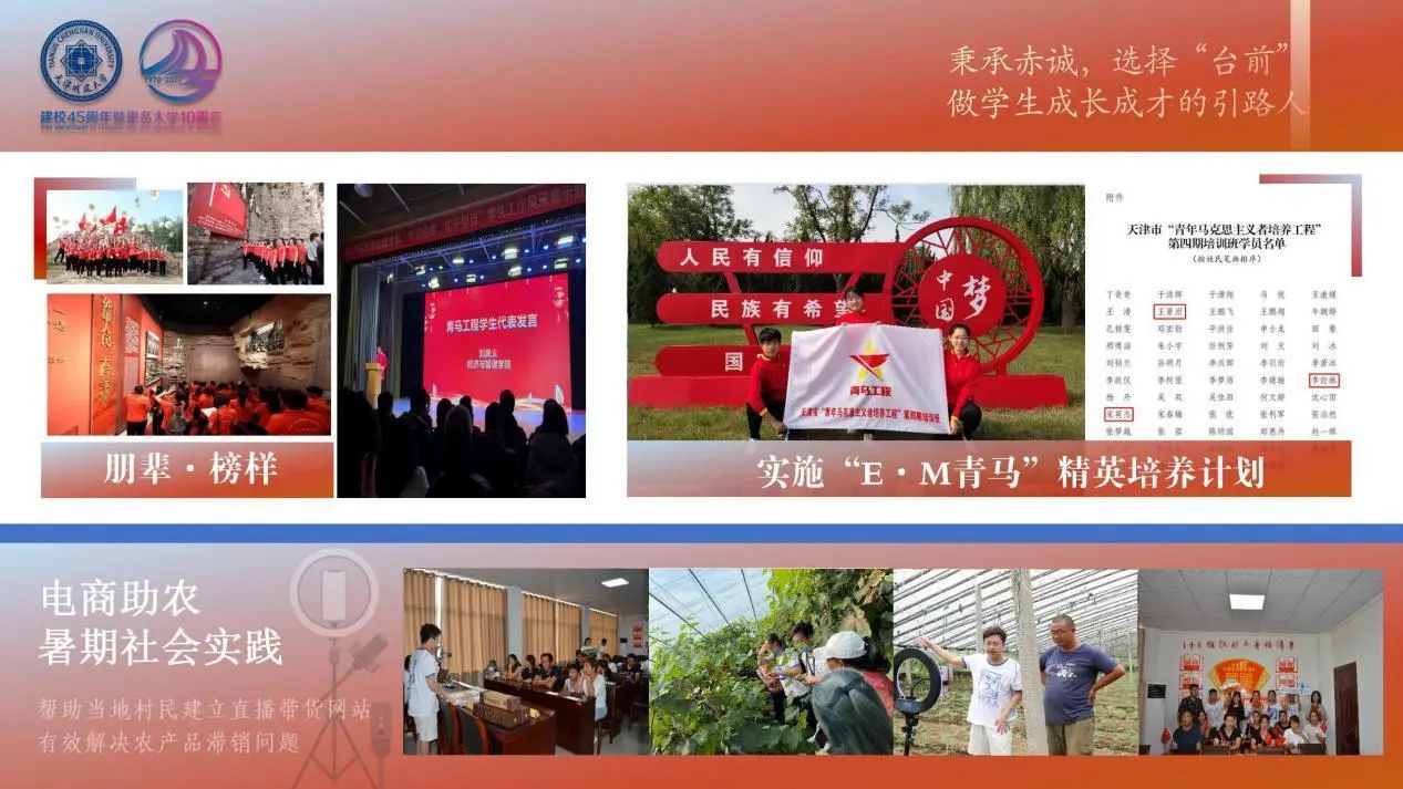 2019年7月,她与294名学生一同启程。工作中她坚持用“真心、真情、真行”的理念,做好学生事务管理和共青团工作。创新基层组织联络和建设模式,“跨校”开展云共建交流会;带领团干部前往南开大学校史馆、烈士陵园、武警部队等地开展主题调研;组织电商助农暑期社会实践,帮助当地村民有效解决农产品滞销问题;实施“E·M青马”精英培养计划,3名学员入选天津市青马,占当年学校整体的四分之三。