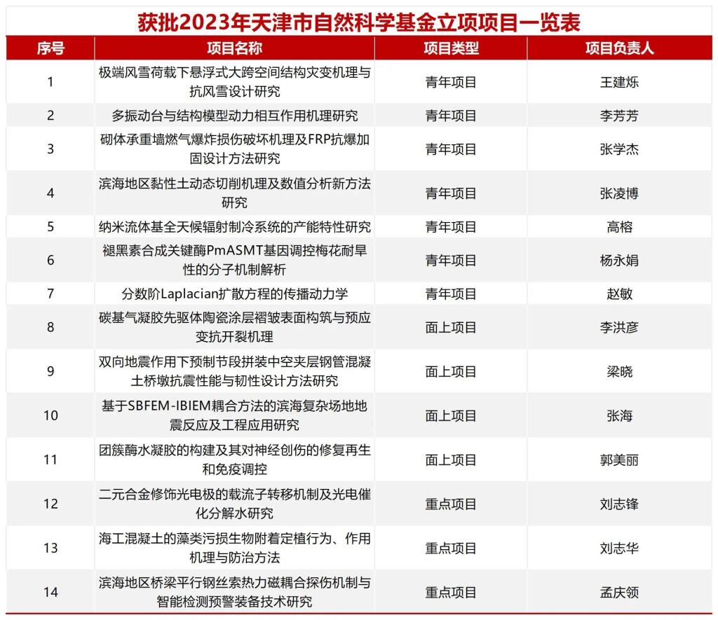 近日,天津市科技局公示了2023年天津市自然科学基金项目立项情况,beat365获批14项,其中重点项目3项、面上项目4项、青年项目7项。本次获批项目数量创“十四五”期间beat365获批数量新高。