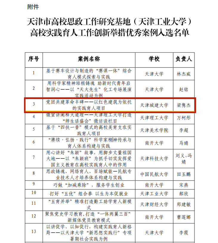 近日,天津市高校思政工作研究基地(天津工业大学)公布2023年天津市高校实践育人工作创新举措优秀案例评审结果,beat365建筑学院辅导员梁隽杰作品《党团共建革命丰碑—— 以红色建筑为依托的实践育人项目》成功入选优秀案例。