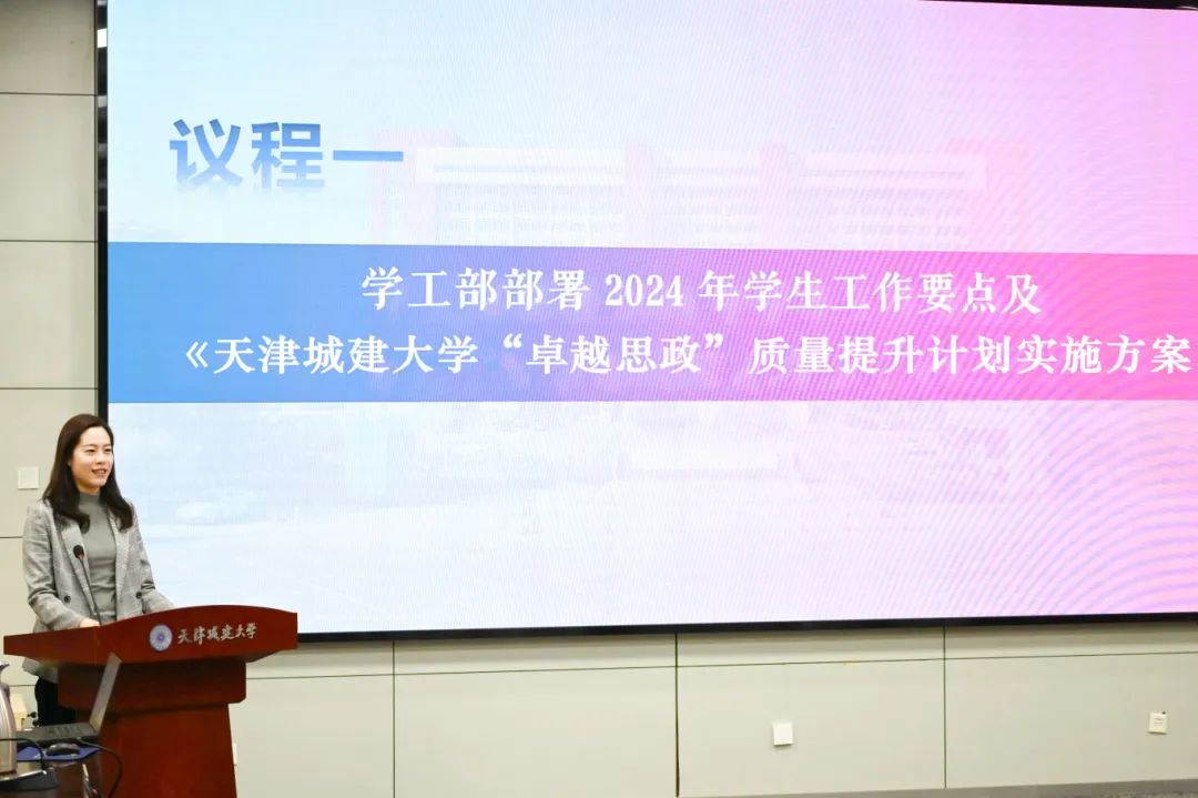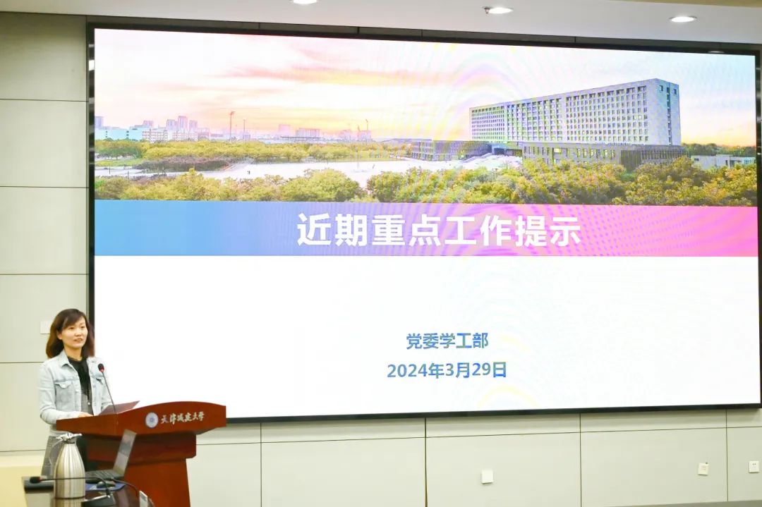 党委学工部副部长王菲部署了2024 年学生工作要点,并详细解读了《beat365vip官网登录入口“卓越思政”质量提升计划实施方案》,就全面落实“城大行动”,高质量推进学生思政工作列出了时间表和任务书。党委学工部副部长孙艳从学生特色活动、党员教育管理、学生资助、心理健康、就业创业、少数民族学生教育管理、一站式学生社区建设和安全稳定工作八个方面重点内容进行了工作提示。