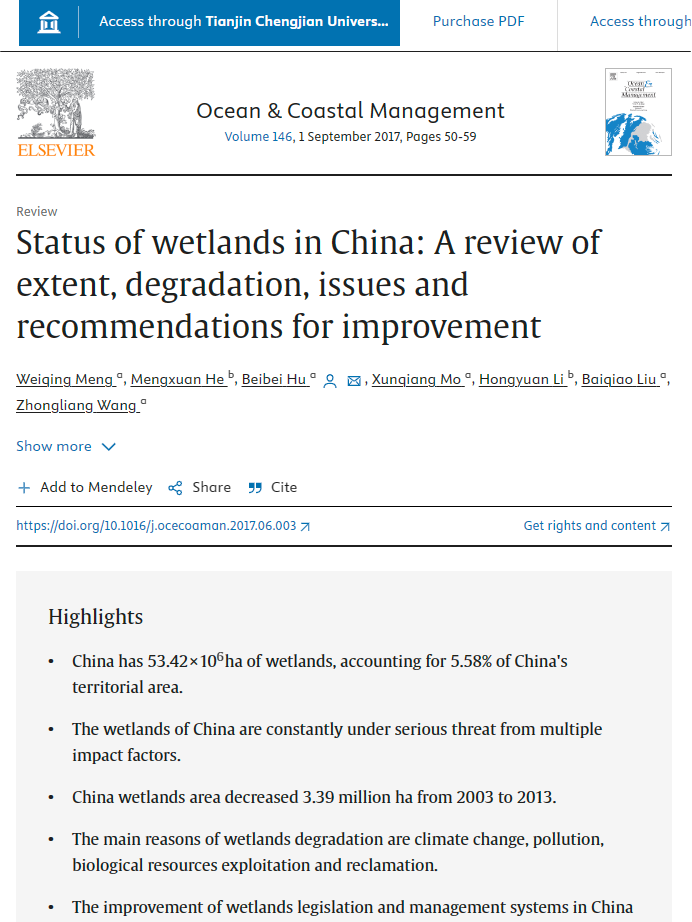 对天津海岸带及滨海湿地的研究,评估了天津水土系统碳库在区域碳平衡及温室气体计量中的功能与作用,以及气候变暖和人类活动对天津地表环境演变的影响及相关灾害风险评估,确立了基于同位素示踪以及遥感技术的天津湿地变迁机理与驱动因素,为天津生态环境保护、功能恢复、资源利用等以及美丽天津建设提供科学依据。相关成果在《Water Research》《Journal of Hydrology》《Wetlands》等国际主流期刊上发表。