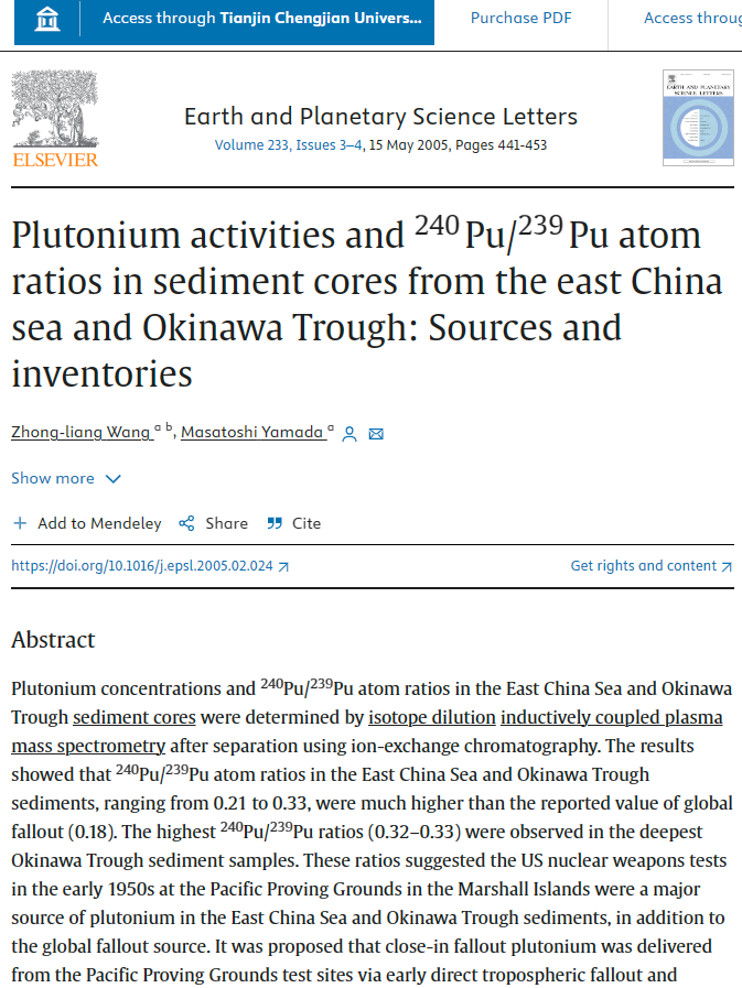 根据研究推断出西太平洋、中国东海和日本沿海地区远超地表均值的人类活动释放的放射性物质主要来自美国在马绍尔群岛进行的核爆试验,推翻了先前由日本和中国台湾学者提出的主要来自中国核试验的观点,受到《朝日新闻》等广泛报道。相关成果在《Earth Planetary Science Letters》《Chemical Geology》等国际顶级期刊上发表。