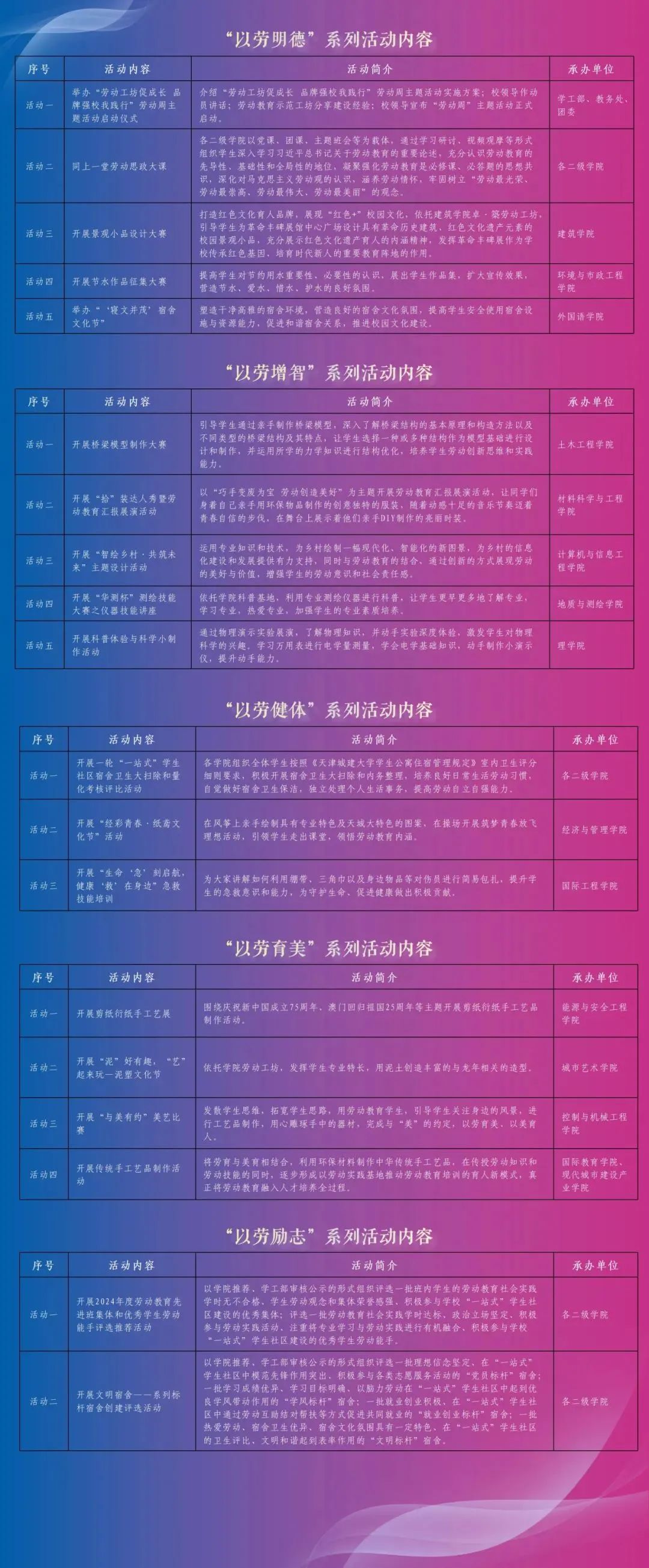 劳动教育是新时代党对教育的新要求,是中国特色社会主义教育制度的重要内容,是培养时代新人的重要途径。“劳动工坊促成长 品牌强校我践行”劳动周主题活动是学校践行“四个善作善成”重要要求,紧扣落实立德树人根本任务,推进“五育并举”,践行“品牌强校”行动的重要举措。此次劳动周主题活动通过系列劳育活动,教育引导青年学生树立正确劳动价值观,掌握必要的劳动技能,养成良好的劳动习惯,培育形成崇尚劳动、热爱劳动、辛勤劳动、诚实劳动的劳动精神,激励青年学生在实践中发现劳动之美,用汗水挥洒青春梦想,用双手创造美好未来,努力成长为堪当民族复兴重任的时代新人。