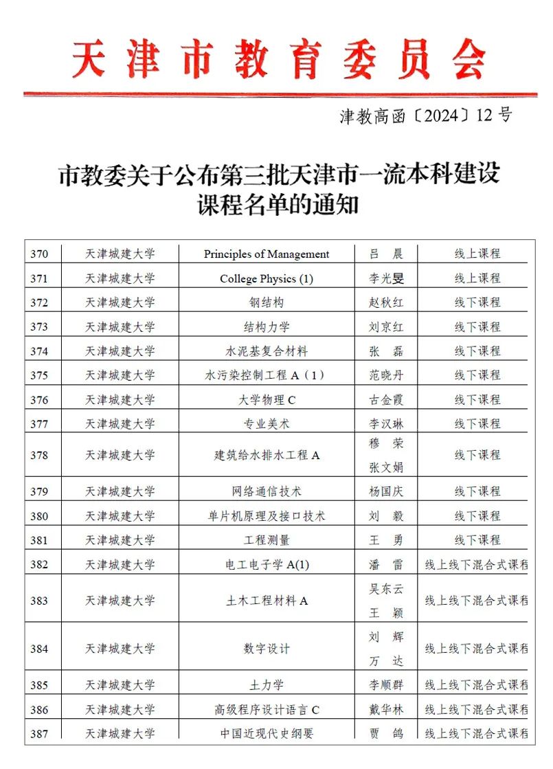 近日,天津市教委发布《市教委关于公布第三批天津市一流本科建设课程名单的通知》,beat365共有18门课程获批第三批天津市一流本科建设课程。其中,线上课程2门,线下课程10门,线上线下混合式课程6门。至此,学校已获批市级及以上一流本科课程52门(含国家级一流本科课程5门),课程建设取得新突破。
