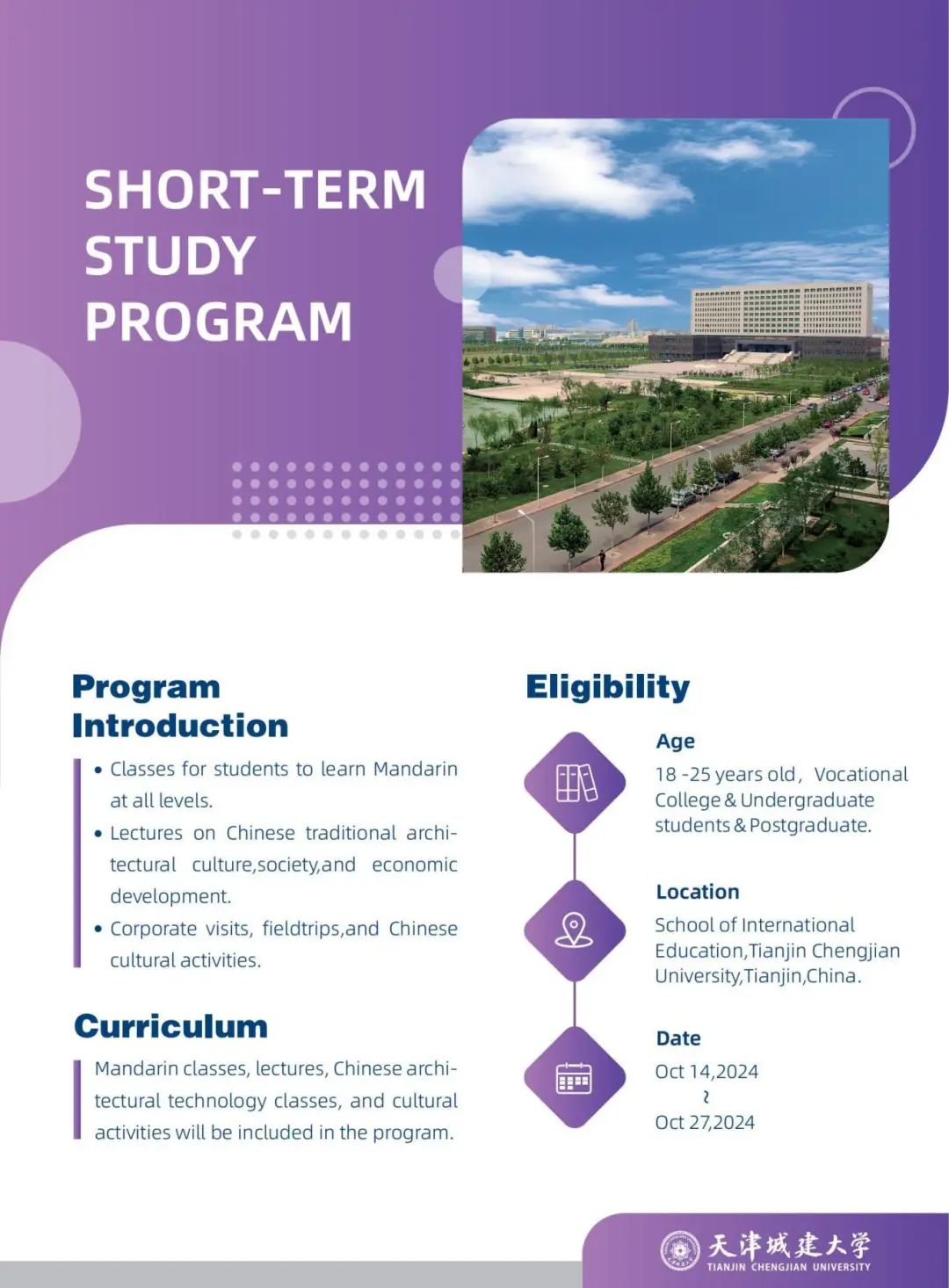 beat365短期学习项目包括汉语学习、中国文化体验和中国建筑技术等3个主题活动,项目时长2周,围绕天津历史建筑和城建文化等主题开展汉语文化体验活动和建筑业相关技术宣讲,让留学生在体会汉语独特的魅力的同时,感受兼具传统和现代特色的中华建筑文化,更全面、深入地了解当代中国。