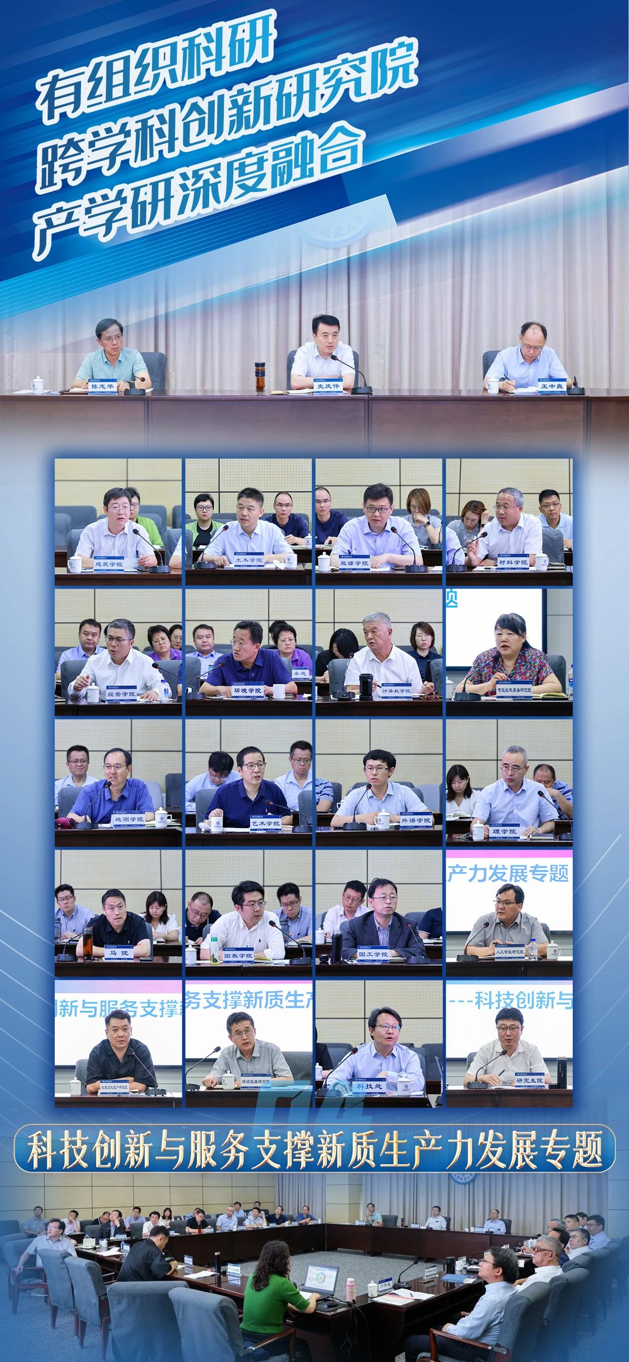 围绕有组织科研、跨学科创新研究院、产学研深度融合等方面进行深入研讨。形成了深化学科交叉融合,开创有组织科研;强化产学研深度融合,加速城建领域新质生产力发展等共识,并进一步明确了学校科技工作的新方向和新抓手。