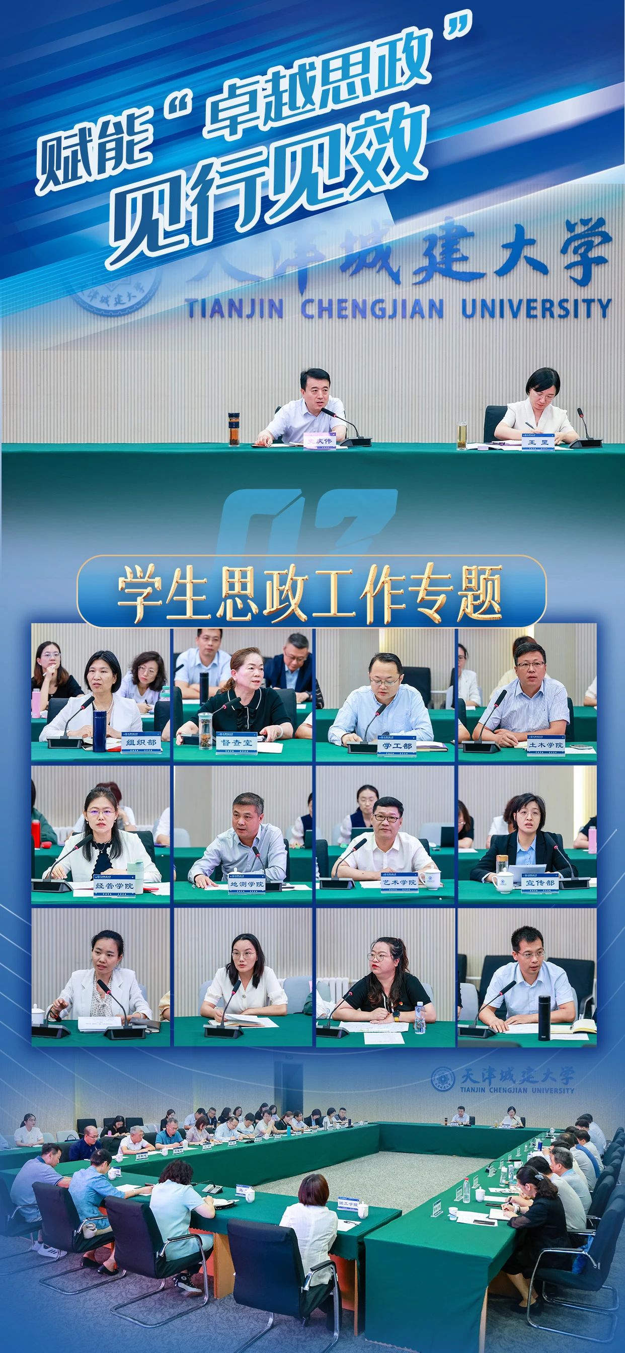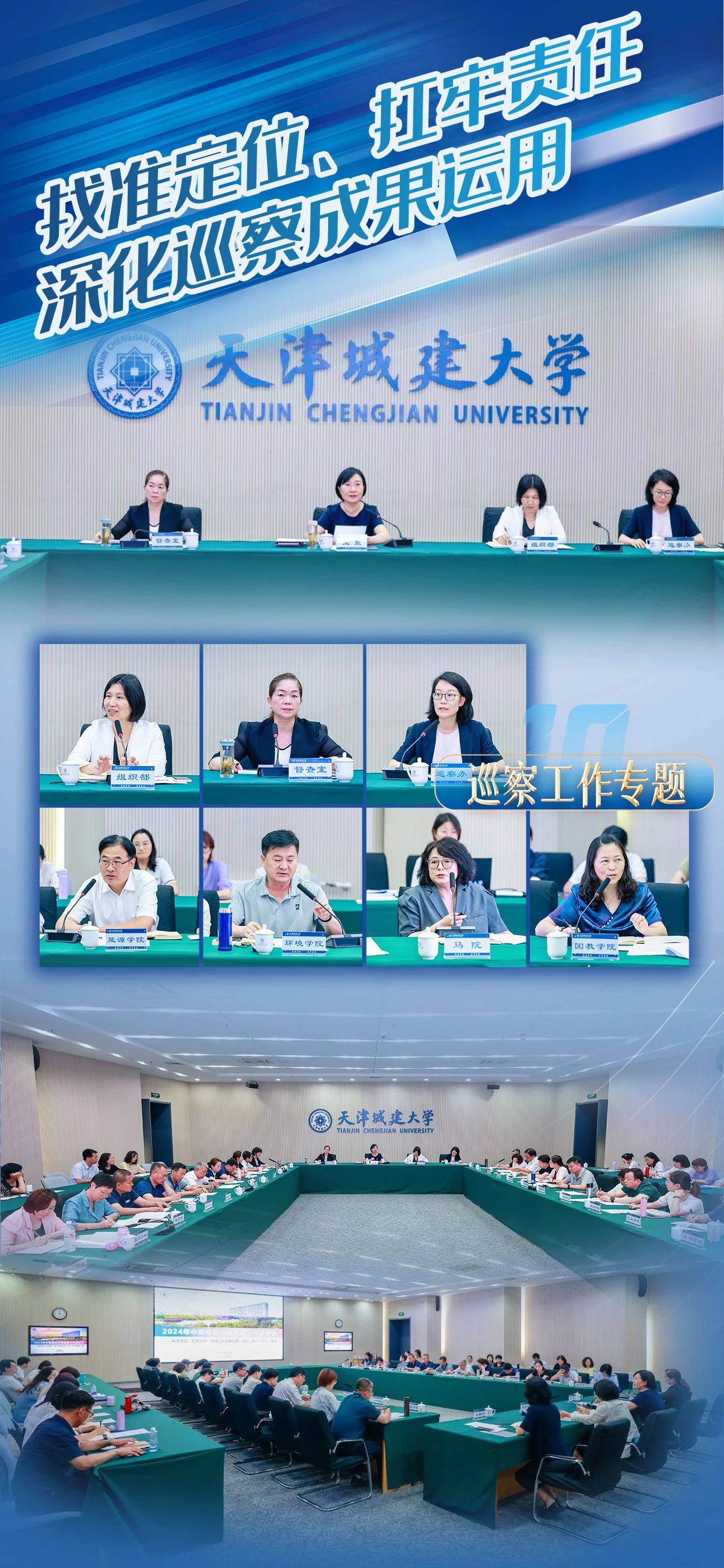 史庆伟全面凝练了上半年学校党的建设和事业发展优势特色亮点,并对下一步工作进行部署要求:一要以政治建设为统领,扎实推进党纪学习教育深入开展,持续推动基层党组织全面进步全面过硬;二要坚持以学生党建为龙头,强化“卓越思政”质量提升计划;三要充分发挥党建引领作用,不断完善教师党建和思想政治工作评价体系,构建高层次人才队伍体系和青年人才发展培育体系;四要以扩面推进新工科专业建设为契机,加大学科专业结构调整力度,创新人才培养模式;五要以新一轮本科教育教学审核评估为契机,推进教学管理体制机制改革创新;六要开展有组织的科研,发挥学校特色学科群优势,全面提升服务国家战略及天津经济社会发展的能力;七要抓好安全稳定工作,坚定不移贯彻总体国家安全观,筑牢校园安全稳定防线,推动平安校园建设提质增效。
