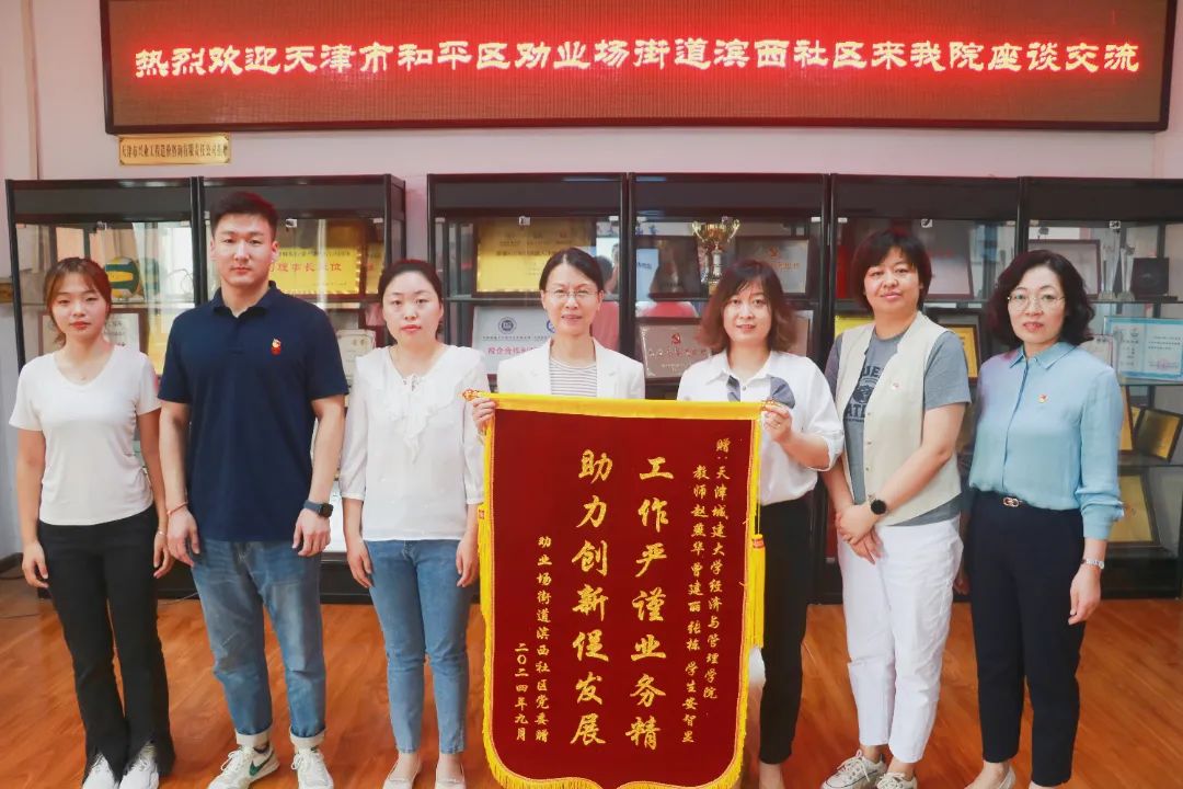 近日,beat365经管学院与天津市和平区劝业场街道滨西社区开展交流共建暨城乡社区智慧治理基层服务站授牌仪式。滨西社区党委书记、居委会主任王媛媛一行,经管学院党委书记宋慧颖和学院相关教师参加活动。