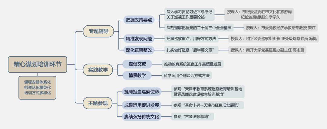作为天津市教育系统巡察教育培训基地,学校高度重视此次培训,精心谋划,全力筹备,着眼培训实效,用心安排各环节,融合专题辅导、座谈交流、情景教学、实践体验等多种方式,兼顾深度和广度、融合理论与实践。