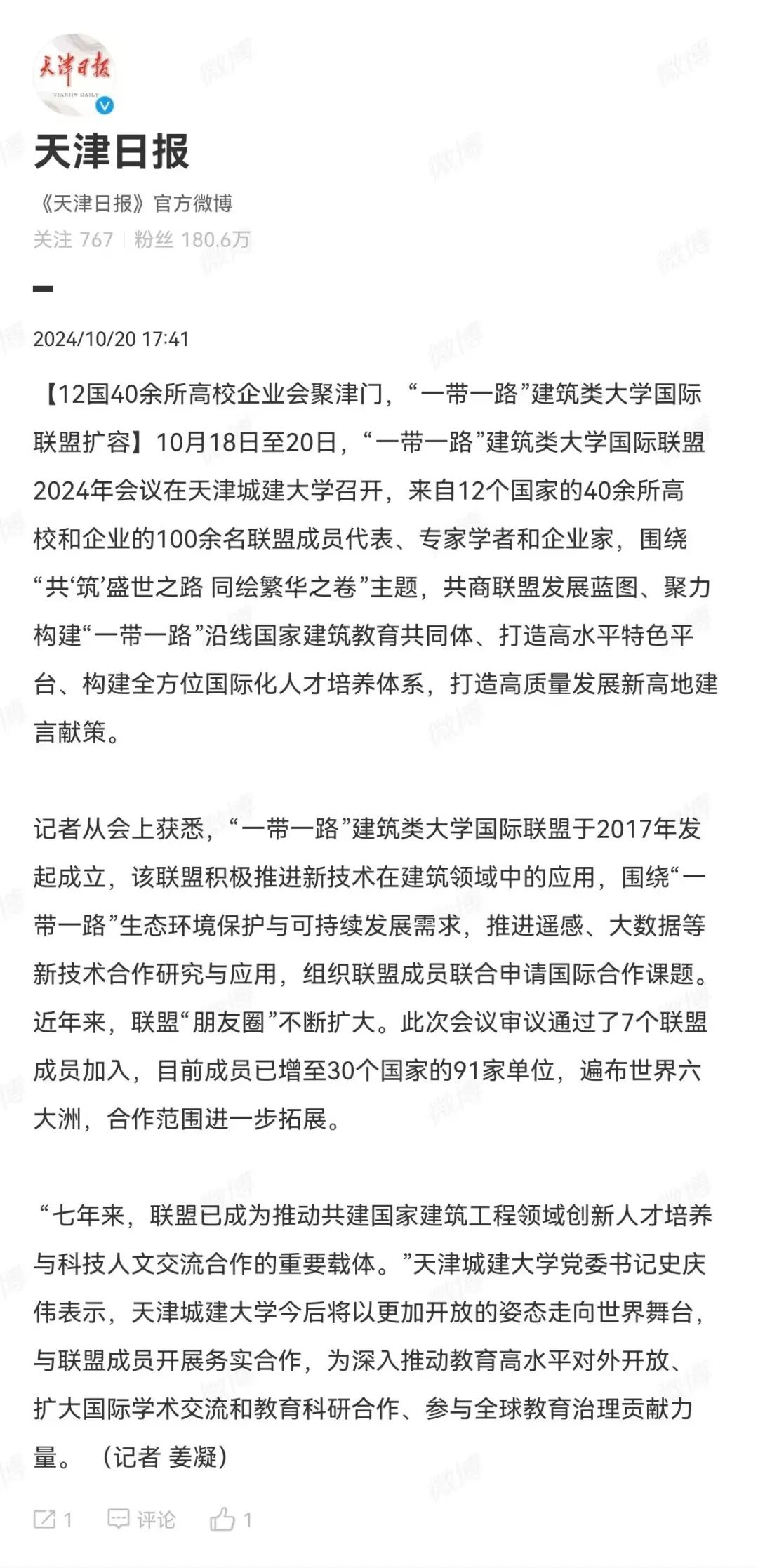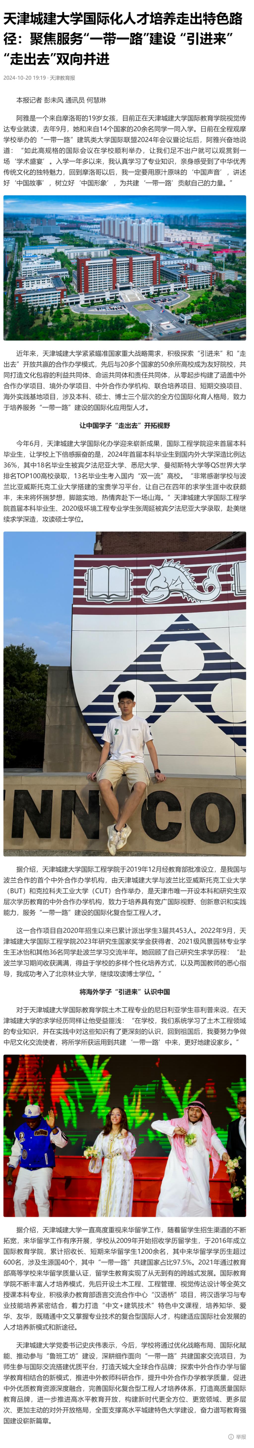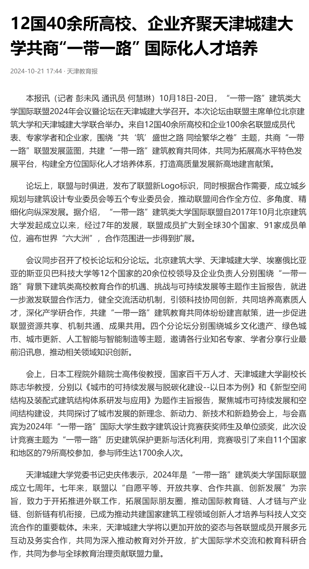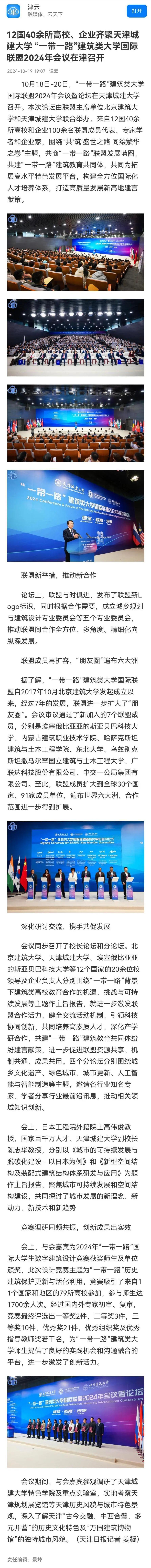 10月18日-20日,“一带一路”建筑类大学国际联盟2024年会议暨论坛在beat365隆重召开。来自12个国家的20余位大学校长和企业家、40余所高校与机构的百余名联盟成员代表,围绕“共‘筑’盛世之路 同绘繁华之卷”主题,共商“一带一路”联盟发展蓝图,共建“一带一路”建筑教育共同体,共同为拓展高水平特色发展平台,构建全方位国际化人才培养体系,打造高质量发展新高地建言献策。会议受到了人民日报、新华社、光明日报、中国日报、中国新闻网、中国青年报、中国教育新闻网、天津日报、津云、天津教育报等多家媒体宣传报道。