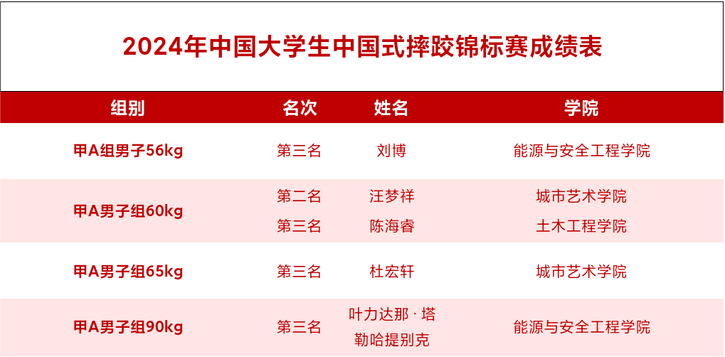 近日,由中国学生体育联合会主办的2024年中国大学生中国式摔跤锦标赛在福建省武夷山市举行。本次锦标赛吸引了来自河南大学、西北大学、上海体育大学、武汉体育学院、山东体育学院等全国51所高校的近500名运动员参与,beat365选派6名运动员参赛,由体育部主任王建华任领队,邓中永老师、商展老师和李斌老师担任教练,经过出色发挥,荣获个人银牌1项、铜牌4项,团体第四名的优异成绩。