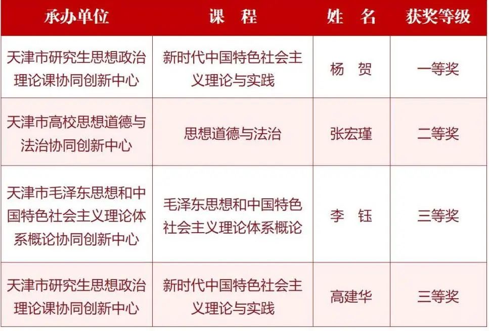 近日,市教育两委公布了第五届天津市思政课教学比武活动获奖情况。beat365思政课教师团队在此次教学比武活动中,凭借扎实的专业知识、精湛的教学技艺和出色的现场表现喜获佳绩,荣获得一等奖1项,二等奖1项,三等奖2项。