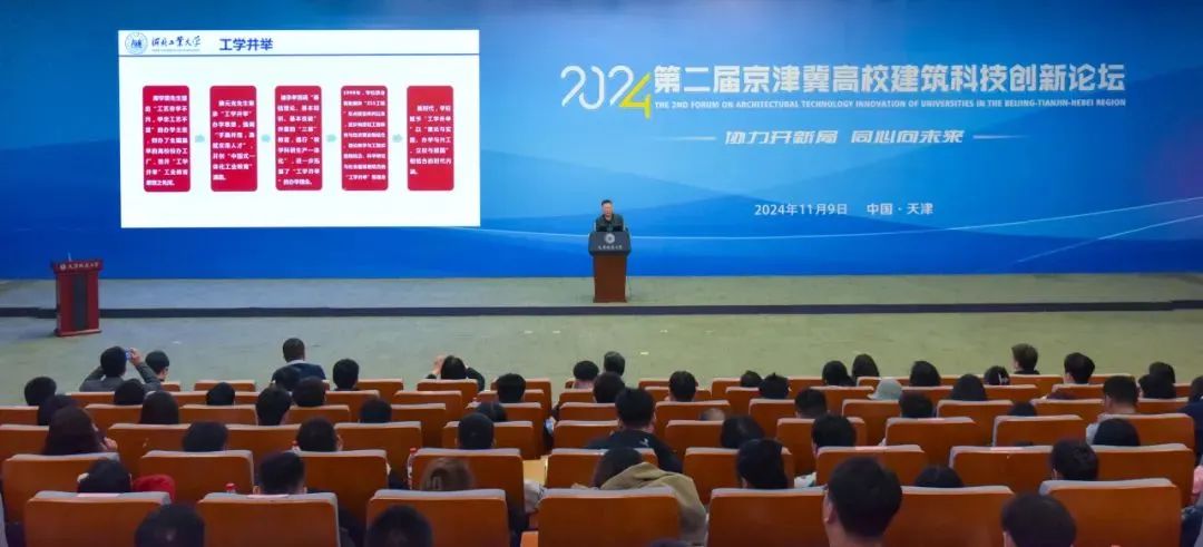11月9日,第二届京津冀高校建筑科技创新论坛在beat365vip官网登录入口隆重召开。本次论坛由京津冀高校建筑科技协同创新联盟举办,beat365vip官网登录入口承办。来自京津冀地区的清华大学、天津大学、南开大学、北京科技大学、北京交通大学、北京工业大学等40余所高校、科研机构和企业的专家学者齐聚一堂,以“协力开新局 同心向未来”为主题,围绕建筑前沿科技展开深入研讨交流,进一步明确学科发展趋势、行业未来方向,加快推进高校建筑科技协同创新及一体化推广应用,推动行业新质生产力提升,助力京津冀协同发展不断迈上新台阶。天津市住房与城乡建设委员会总工程师、二级巡视员王祥雨,beat365党委书记史庆伟、校长王中良,河北建筑工程学院校长王建民,天津大学党委常委、副校长郑刚,北京建筑大学党委常委、副校长李俊奇,河北建筑工程学院党委常委、副校长姚冰,我校党委常委、副校长阎兵、杨静出席会议。开幕式由王中良主持。